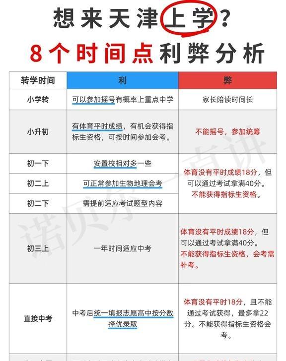 天津上学8个时间点一次性看懂利弊 除了以上8个时间点的利弊分析外,还有几点需要额外给各位家长说的 1️⃣重点学校一般没有学位接收转学。 2️⃣小学转学后,小升初能不能摇号要看所在区政策具体要求 3️⃣如果没有体育平时成绩,要好好锻炼,争取中考体育时拿满分。 4️⃣指标生只是针对一部分学生的,不是所有人都能拿到,但是如果和重点校的差距,指标生的得分能覆盖,就有机会去重点了,所以要看孩子的成绩来规划这件事。 5️⃣高一是最后的转学时机。