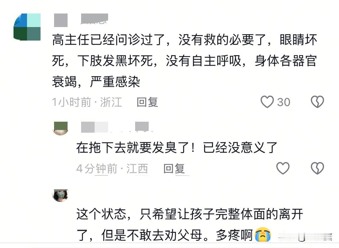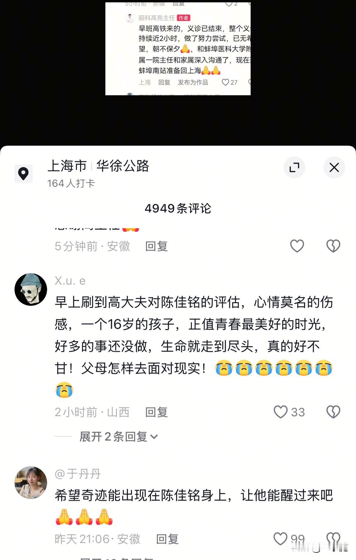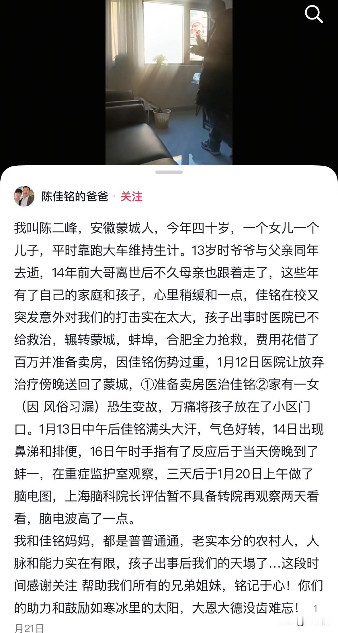 无比悲痛,安徽16岁的陈佳铭的已经进入濒死状态!脑科专家高医生对他进行了义诊,最终,给出了朝不保夕的结论。 陈佳铭,安徽蒙城人,他是当地一所中学的学生,悲剧发生在2025年12月16日。 当天陈佳铭和同学在嬉戏打闹之时,不慎被绊倒了,他重重的摔倒在地后当即没了反应。 最终,陈佳铭因心脏骤停导致了大脑缺氧。纵使医生想方设法救治他的生命,但陈佳铭仍因伤势过重迟迟没有醒来…… 一个多月的时间,就这样过去了。期间,陈佳铭先后多次转院治疗,有无数爱心人士纷纷为他慷慨解囊,本以为可以用爱等来奇迹,奈何,却还是等来了一个最不想看到的消息。 1月25日,脑科专家高医生特意乘坐最早一班高铁从上海赶往当地来义诊。 高医生分文不取,还自己倒贴了来回车费。他细细的评估了陈佳铭的各项情况, 整场义诊时间超过了75分钟。奈何最后的情况,真的不容乐观。 尽管高医生用词非常含蓄,但大家还是一看就懂。 陈佳铭的病情非常严重,已濒临死亡。他没有自主呼吸,身体多器官衰竭。脚已经发黑坏死,眼睛也不太正常了,几乎没有逆转的可能性了!也就是说,陈佳铭随时都有可能离开人世。 可怜的陈佳铭,他才16岁啊,如此风华正茂的年纪,真的太让人心疼了!如果没有那一场意外,此时此刻他应该是在书声朗朗的教室里。 从小,他就是一个很乖的孩子,成绩还不错,从小到大拿过不少奖状。他的父亲是一名货车司机,母亲是一个普通的家庭妇女。他家虽然不是很富裕,但一家人相亲相爱,过的很幸福。然而,所有的一切都在他陷入深度昏迷后戛然而止了! 经此一事,希望所有孩子们都要有所反思:凡事注意安全,平日里嬉戏打闹要有度。 在这个事件里,没有人愿意看到这样的结局,但事已至此,只能接受现实。在此说什么安慰的话语都是苍白的,唯愿这个少年最后的日子能够舒心一点![祈祷][祈祷]