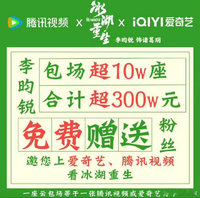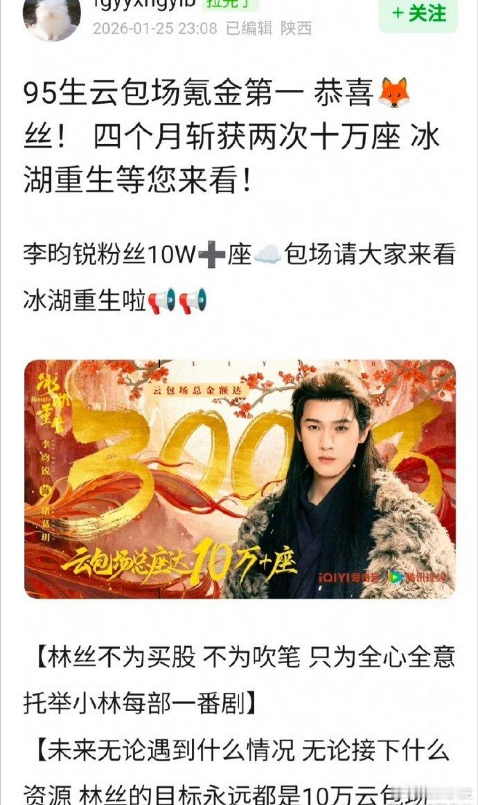 李昀锐粉丝第二个10w座云包场李昀锐首位双10万座云包场95生李昀锐粉丝为《冰湖重生》又准备了10w云包场,成为首位双10万座云包场95生