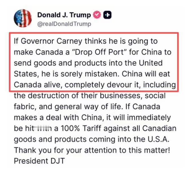 美国现在敢动中国吗?脸面都不要了!特朗普今天发文说:“这个世界最不需要的,就是让中国吞并加拿大。这事绝不会发生,连一丁点可能性都没有!感谢各位关注此事。”   24小时前,特朗普的社交媒体账户突然发出了一条惊人的动态,内容引发了广泛关注,屏幕上赫然写着,这个世界最不需要的,就是让中国吞并加拿大,这事绝不会发生,连一点可能性都没有!     几天前卡尼刚刚结束了他的访华之行,他在北京谈的并不是割地赔款,而是油菜籽、大豆的出口配额,以及清洁能源等合作项目,与此同时,特朗普却在华盛顿大喊“中国吞并加拿大”,这明显让人感到很大的反差,甚至让人不禁怀疑背后隐藏着更深的政治图谋。   回头看看,特朗普此举显然不是一时的情绪失控,而是一次精准的政治操作,意在转移焦点,我们不需要复杂的政治学理论,只需稍微回顾一下近期的新闻,就能看清真相。   特朗普似乎有意通过制造一个“地缘政治危机”来吸引公众的注意力,转移对自己困境的关注,这种做法,典型的就是“围魏救赵”,把矛盾焦点转移到他想要的地方。   事实上,这场戏的火药味早在瑞士达沃斯的雪山下就已经埋下了种子,在达沃斯论坛上,卡尼公开批评了“霸权”,并强调与中国的合作“可预测且有规则”。   这番言论显然触动了美国的神经,尤其是习惯了以关税大棒施压他国的华盛顿,对于特朗普来说,这不仅是对他的冒犯,更像是背叛,因此报复也迅速而直接。   特朗普的推文看似猛烈,但其背后反映的其实是他对加拿大的一种“控制欲”,稍微翻看一下历史记录,你会发现,特朗普曾多次将加拿大称作美国的“第五十一个州”,甚至在公开场合戏谑地称加拿大总理为“州长”,在特朗普的眼中,加拿大不仅是一个邻国,更像是美国的后花园,任何其他国家与加拿大合作,都被他视为“入侵”。   那时候丹麦政府不得不郑重声明,格陵兰岛周边并无中国军舰,仅有常规航运活动,如今,特朗普仍在指责中国“吞并”加拿大,实则不过是将自身内心的野心向外投射罢了。   然而,现实的力量正在发生改变,加拿大不再是美国的附庸,也不打算继续单纯依赖美国,随着加拿大对美出口数据的逐年下降,加拿大政要已经意识到,单一依赖美国的战略已经不再可靠。   因此,他们开始寻求与更多国家的合作,尤其是中国,与其说加拿大在“被吞并”,不如说它正在主动“逃离”美国的单极依赖,转向一种更加灵活和多元的合作模式,无论是欧洲,还是中国,只要能修铁路、建电站、买大豆,都是值得合作的好伙伴。   卡尼在达沃斯上强调“可预测性”,这正是加拿大在当前全球不确定性中所需要的,与其与一个情绪波动大的“大哥”合作,不如选择一个稳定的合作伙伴,毕竟,在国际贸易中,稳定性和可预见性才是企业最需要的条件。   特朗普的推文虽然在短期内能吸引大量关注,甚至冲上全球热搜,但这些并不能改变现实中的贸易数据,无论特朗普如何在社交媒体上制造话题,货物装满的集装箱依然在太平洋上默默航行,经济的现实将继续推动中加之间的合作。   喧嚣的推特治国,终究敌不过沉默的贸易数据,特朗普或许可以通过煽动舆论来收获选票,但对于国家的未来与经济发展来说,依赖虚张声势的言论远不如脚踏实地的合作与发展。