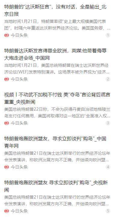 特朗普在台上口出狂言,台下的一批美国高官,脸色一个比一个难看! 美国总统特朗普在达沃斯论坛上的“表演”,既在外界的预料之内,又不在。 为什么这么说呢? 麻烦看官老爷们右上角点击一下“关注”,既方便您进行讨论和分享,又能给您带来不一样的参与感,感谢您的支持! 美国总统特朗普在达沃斯论坛上的 “表演”,既在外界的预料之内,又在意料之外。外界早料到他会延续强硬的单边主义风格,却没料到他会把这场全球经济论坛,变成毫无底线的个人秀和对盟友的公开发难场。 当地时间 1 月 21 日,特朗普时隔六年再次现身达沃斯世界经济论坛,还带着美国史上规模最大的代表团出席。他发表了长达一小时的演讲,彻底抛开论坛聚焦全球发展的核心议题,全程只围绕自己的政治诉求发声,让这场多边盛会沦为他的个人秀场。 这场演讲里,特朗普把霸权主义展现得淋漓尽致,对着欧洲盟友展开全方位的指责和发难。他全盘否定欧洲推行的绿色能源、移民和贸易政策,直言欧洲因这些政策变得 “面目全非”,字里行间满是不屑和否定,完全无视各国的发展自主选择。 谈及格陵兰岛问题时,特朗普更是扭曲历史、强词夺理。他将格陵兰岛定义为美国核心国家安全利益,声称美国在二战中保护、战后无偿归还该岛,指责丹麦 “忘恩负义”,还强硬要求丹麦立刻开启格陵兰岛的收购谈判。 事实上,丹麦对格陵兰岛的主权有明确的国际法依据,美国当年的相关行动也都是基于双边协议,并非单方面的 “施恩”,特朗普的这番言论完全是无稽之谈。他还放话丹麦要么答应谈判,要么美国会记住这个拒绝,充满胁迫意味。 不仅如此,特朗普还在演讲中对多位外国政要进行言语贬低和调侃,他嘲笑法国总统马克龙的个人形象,还直言加拿大 “靠美国生存”,指责加拿大受美国恩惠却不知感恩,言语间的傲慢和轻视溢于言表,丝毫没有大国领袖的基本素养。 台下的美国代表团成员,看着台上信口开河的总统,脸色全都格外难看。美国国务卿鲁比奥等一众内阁要员,全程面露难堪与无奈,他们清楚地知道,特朗普这些出格言论会严重损害美国的国际形象,更会让本就出现裂痕的美欧盟友关系雪上加霜。 可即便心知肚明,这些内阁官员却没有任何办法阻止。特朗普的演讲全程按照自己的意愿发挥,根本不顾及团队的外交考量,一众高官只能坐在台下,直面这场由总统亲手制造的外交尴尬,承受着来自各国参会者的异样目光。 特朗普的离谱言行,不仅让台下的美国官员无地自容,也遭到了美国国内各界的强烈批评。加利福尼亚州长纽森公开表示,特朗普的演讲既粗鲁又无聊,其关于格陵兰岛的无理要求,若欧洲不坚决回应,未来必会面临更多麻烦。 肯塔基州州长安迪・贝希尔也直言,特朗普的演讲充满危险信号,这样的言论不仅会破坏美国与盟友的关系,还会让美国在国际社会陷入孤立。除了政界人士,美国国内众多媒体也对这场演讲提出严厉批评,直言其给达沃斯论坛带来了紧张的恐惧氛围。 英国《卫报》更是直接评价,特朗普是带着 “侮辱大炮” 走进达沃斯会场,他的演讲充斥着种族主义暗示,还将国内的社会矛盾与特定族群挂钩,这样的言论早已越过政策讨论的边界。BBC 记者在现场报道,会场气氛因特朗普的言论变得极度紧张尴尬。 《纽约时报》也指出,特朗普的演讲把丹麦、北约、欧洲多国领导人甚至美国国内部分群体都当成了攻击对象,其言论多次引发现场参会者的吸气声和紧张笑声,原本的经济论坛,愣是被他搅成了一场地缘政治的闹剧。 特朗普之所以在达沃斯论坛上如此肆无忌惮,根本不是为了推动美国的外交发展,也不是为了促进全球合作,而是出于国内的选举算计。随着美国选举的临近,特朗普急需通过对外展现强硬姿态,转移国内民众对民生、经济等问题的关注。 他试图借着达沃斯论坛的全球关注度,塑造自己 “为美国谋利” 的强硬形象,拉拢国内保守派选民的支持,同时也想通过向盟友施压的方式,为美国攫取更多实际利益,用这种简单粗暴的方式,为自己的选举增加筹码。 为了达成这个目的,特朗普甚至不惜抛弃美国长期以来的外交准则,践踏国际规则,将单边主义和交易式外交发挥到了极致。他一边对欧洲盟友进行言语羞辱和经济胁迫,一边又假意释放和解信号,撤回对欧洲八国的关税威胁,上演着极限施压的戏码。 可特朗普显然打错了算盘,他的这番操作,看似为自己赚足了眼球,实则让美国的国际信誉再次遭受重创。欧洲多国已经对美国的承诺产生严重质疑,丹麦首相直接重申,格陵兰岛的主权问题是红线,绝不容谈判,格陵兰岛自治政府也明确拒绝了特朗普的无理要求。 就连美国的亚太盟友也开始感到担忧,日本、韩国等国的专家纷纷表示,特朗普对欧洲盟友的胁迫行为,让他们不得不重新考量美国承诺的可靠性,亚太地区的安全架构也可能因此受到冲击,美国的盟友体系正在因特朗普的言行逐渐松动。