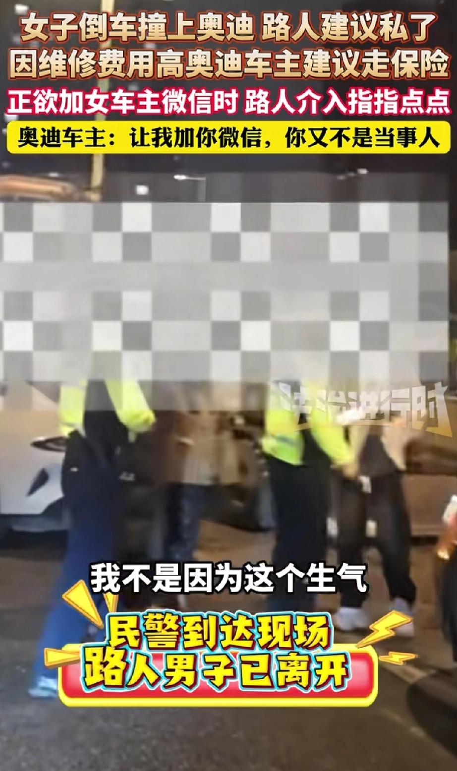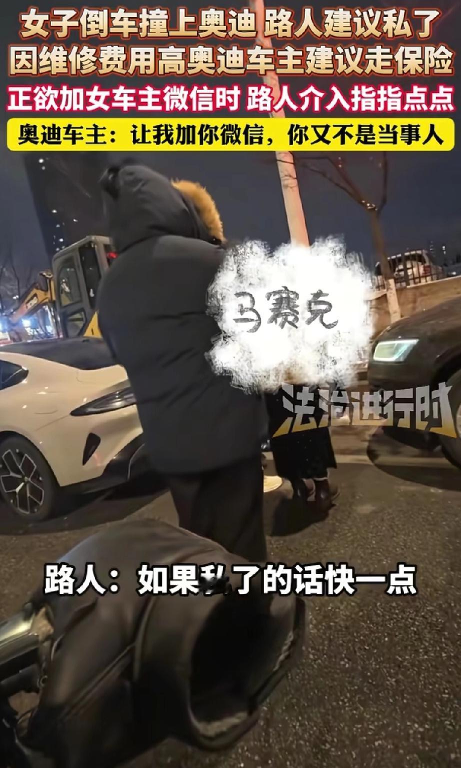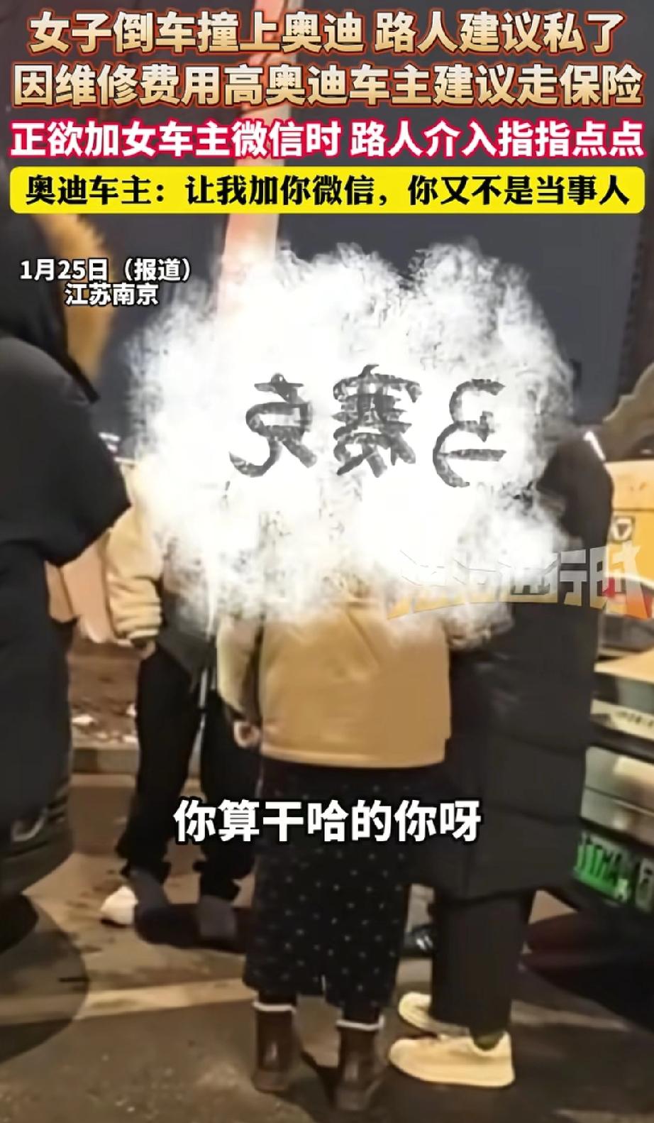 看热闹不嫌事大!南京,女子倒车不小心撞了奥迪。奥迪车主好心建议走保险,怕对方赔太多。可旁边突然冒出个路人大哥,使劲劝双方“私了”,还替女司机讨价还价。结果聊半天,他竟不是女司机朋友,也不是车主——纯属瞎搅和!奥迪车主气得直接报警,那位“热心”路人悄悄溜了。 事故发生后,奥迪车主很冷静,看了车损,主动对女司机说:“咱走保险吧,不然修车贵,你私了压力大。” 这时,一位路人大哥插进来,对着奥迪车主指指点点:“私了多少钱?你开个价!” 车主愣了一下,还以为他是女司机熟人,就认真解释:“我一个大灯就九千,私了几千块你愿意给吗?我是为你们考虑。” 没想到大哥一脸无所谓,还要加微信谈。正要加时,他突然说:“我不是当事人,就是路过看看。” 奥迪车主当场火冒三丈!你不是当事人,在这儿装什么“和事佬”?耽误时间还乱出主意!车主立刻不再纠缠,直接打电话报警。等警察赶到,那位“热心”大哥早就没影了。 有网友讽刺:“这大哥是想‘英雄救美’吧?结果演砸了!” 也有网友怀疑:“该不会是修车店的‘托儿’,想揽私活吧?” 要我说,这种人就是 “看热闹不嫌事大” !表面装热心,实际就是想过把“指挥瘾”。真要替他私了赔了钱,后面维修费不够,他负责吗?他早溜了! 马路上遇到事故,最怕这种不懂装懂的“搅局者”。他们随口一句话,可能就让新手司机吃大亏。记住:真正为你着想的人,会尊重保险流程,而不是瞎劝私了! 以后咱们要注意 1️⃣ 遇事故,车主之间商量,无关路人别插嘴。 2️⃣ 保险就是用来保障的,该走流程别犹豫,别听人忽悠“私了省钱”。 3️⃣ 马路上守规则、按章办事,才是最高效的解决方式。 那些乱出主意的“热心人”,往往只会让事情更糟——远离搅局者,相信专业流程! 女子倒车撞上奥迪 车主建议走保险
