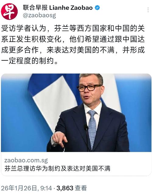 新加坡联合早报今天(1月26日)报道:“受访学者认为,芬兰等西方国家和中国的关系正发生积极变化,他们希望通过跟中国达成更多合作,来表达对美国的不满,并形成一定程度的制约。”   作为连续21年芬兰在亚洲最大的贸易伙伴,中国去年和芬兰的双向投资存量突破230亿美元。   这个数字背后,是芬兰机械巨头卡尔玛在中国港口的自动化设备,是诺基亚在苏州的5G研发中心,更是北极圈内罗瓦涅米林场砍伐的云杉,正通过中欧班列变成中国家具厂的原料。   芬兰人心里清楚,他们338万人口的国内市场,装不下森林工业和清洁能源的全部产能,而中国2800个县级市场的需求,足够让这些企业的生产线转起来。   这种务实从历史里就能找到影子。1950年芬兰成为第五个承认新中国的西方国家,没谈任何附加条件。   1953年那份新中国与西方国家的首份政府间贸易协定,让芬兰的纸浆换来了中国的农产品,填饱了战后欧洲的肚子。   北约的军事捆绑没能锁住外交的灵活性。芬兰去年刚向美军开放15个军事基地,转头就在北京签了新能源合作备忘录。   这种看似矛盾的选择,在赫尔辛基的决策者看来再自然不过:加入北约是为了应对看得见的安全威胁,靠近中国是为了守住摸得着的经济命脉。就像芬兰总理访华前接受采访时说的:"我们不会在安全与面包之间做选择,成年人都知道两者都需要。"   美国可能没算清楚一笔账:当他们用"友岸外包"胁迫盟友选边时,芬兰企业正在用脚投票。2025年芬兰对华出口中,高新技术产品占比达到38%,远超对美出口的22%。这种产业层面的绑定,比任何政治承诺都更持久。去年诺基亚把6G研发中心设在杭州,不是因为地缘战略,而是这里有全亚洲最完整的通信产业链——这种基于市场的选择,连政府都很难扭转。   欧盟的"去风险"政策在北欧遇到了现实阻力。当布鲁塞尔讨论对华投资审查时,芬兰经济部长公开表示:"限制对华合作只会让我们的企业失去竞争力。"   这种声音在欧洲越来越普遍——德国机械工业联合会的数据显示,2025年中国市场贡献了该行业21%的利润,这个数字在美国只有14%。当企业的财报比政客的演讲更有说服力,所谓的"阵营对抗"自然就成了空中楼阁。   格陵兰岛的冰层下,藏着全球10%的稀土资源。美国想借芬兰的北极基地染指这片区域,却忘了芬兰和丹麦是百年盟友。去年特朗普提议组建"北极和平委员会"时,芬兰外交部的回应很委婉:"我们更尊重现有主权框架。"这种表态的底气,来自中国在北极航道开发中的建设性角色——当芬兰的破冰船需要升级技术,第一个想到的合作伙伴就是中船集团,因为这里有全球最丰富的极地船舶建造经验。   中欧关系的深层逻辑正在回归本质。芬兰此次带来的合作清单里,没有敏感的5G或芯片,全是绿色能源、循环经济这些"低政治"领域。   这种选择既避开了美国的猜忌,又契合双方的发展需求——中国需要北欧的节能技术实现"双碳"目标,芬兰需要中国的市场消化其创新成果。商务部的数据显示,2025年中芬在绿色领域的合作项目同比增长47%,这种增长不是靠口号,而是靠企业的订单堆出来的。   美国的单边主义正在制造反向动力。当特朗普政府威胁对欧洲加征汽车关税时,德国车企加大了在中国的新能源投资;当美国试图拉拢北欧对抗中国时,芬兰反而深化了与中国的数字经济合作。这种"你逼我退"的效应,在2024年达到顶峰——那年美国对芬兰木材加税,直接促成了中芬林业碳汇合作项目的落地,芬兰的森林碳汇指标开始卖给中国的碳中和企业。   欧盟内部的分化肉眼可见。当南欧国家跟着美国喊"脱钩"时,北欧国家在闷声发财。2025年中芬贸易逆差转正,芬兰对华出口首次超过进口,这在中欧贸易中并不常见。这种转变的背后,是芬兰成功把科技优势转化为市场竞争力——他们的生物质能技术在中国东北的秸秆利用项目中落地,中国的风电设备也在芬兰的北极圈内运转。这种双向奔赴,让任何"阵营"的说辞都显得苍白。   最后要算的是时间账。从1950年建交到现在,中芬关系经历过冷战的对峙、苏东的剧变,却始终保持着稳定。这种稳定性源于双方对"国家利益"的朴素认知:中国需要北欧的技术和市场多元化,芬兰需要中国的需求和产业链韧性。当美国试图用"价值观"绑架这种关系时,两国用持续增长的贸易数据给出了答案——2025年80亿美元的双边贸易额,比任何外交声明都更有说服力。