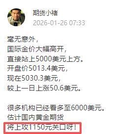 周一, 国内黄金期货继续强势运行, 主力合约盘中最高升至1151.7元, 最终收盘于1143.32元。 如期试探1150元压力位, 符合早盘的分析。 近期黄金持续飙升, 风险与日俱增, 建议大家获利了结, 空仓观望比较好!