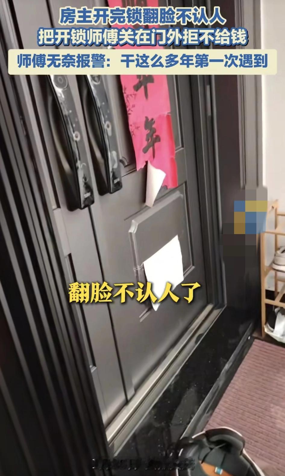 安徽安庆一位开锁师傅发视频称在一居民价开完锁之后没想到对方翻脸不认人,自己反锁在里面,开锁师傅称,从业这么多年以来,不给钱的还是少见,最多就是开完锁会跟自己讲价,它的价格一般是普通锁50块钱,开智能锁收100,直到警察过来的时候,对方才给了钱。