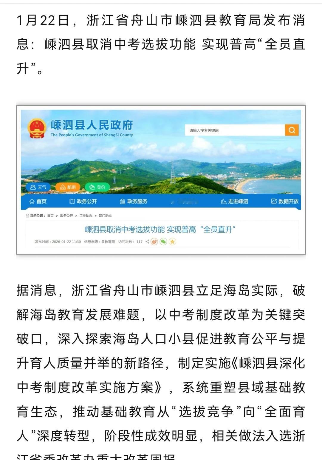 取消中考选拔功能,全员直升高中:舟山嵊泗 浙江舟山市嵊泗县取消中考选拔功能,全员普高直升。后面会不会是全市,全省,乃至全国呢? 城乡教育资源的差距 升学规划 中考上岸 中高考