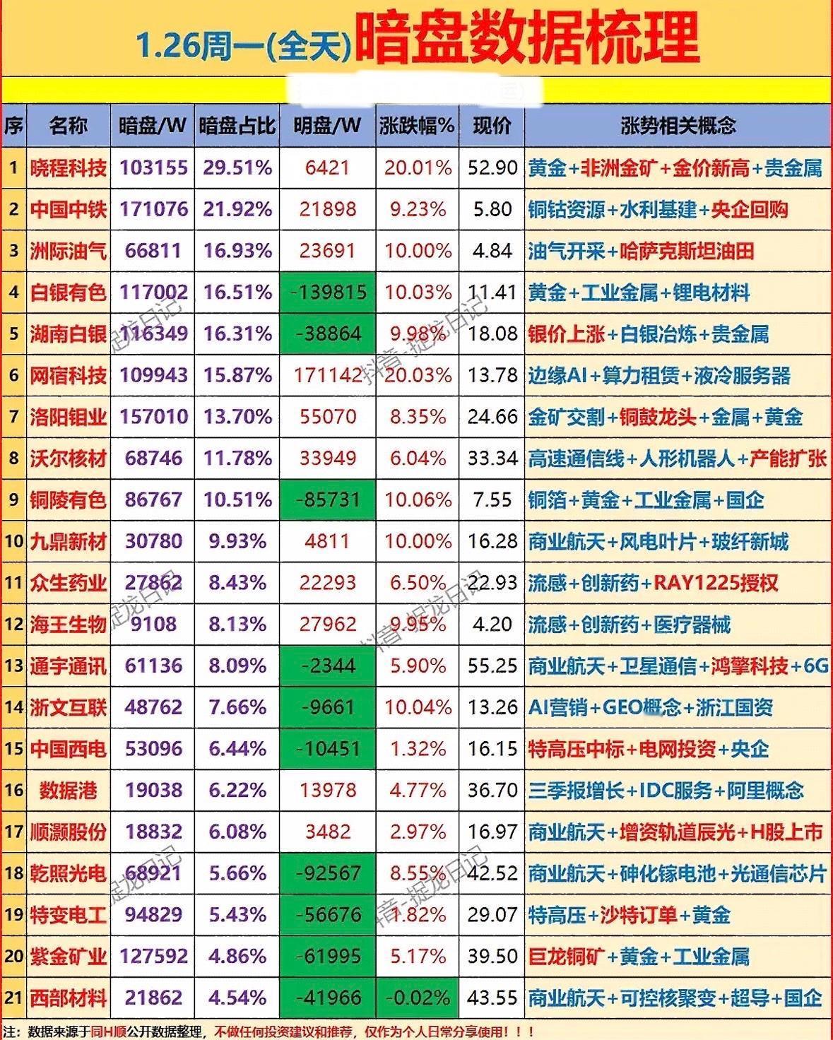 1月26日周一大盘数据梳理 📈📉 涨跌榜分析,把握市场动向! "贵金属与工业股齐飞,黄金白银领涨!油气、AI算力、创新药轮动,暗盘交易活跃,注意风险哦~" "贵金属与工业股领涨,黄金白银概念强势,油气、创新药板块活跃,多只个股涨停,市场热点分散但趋势向好。"