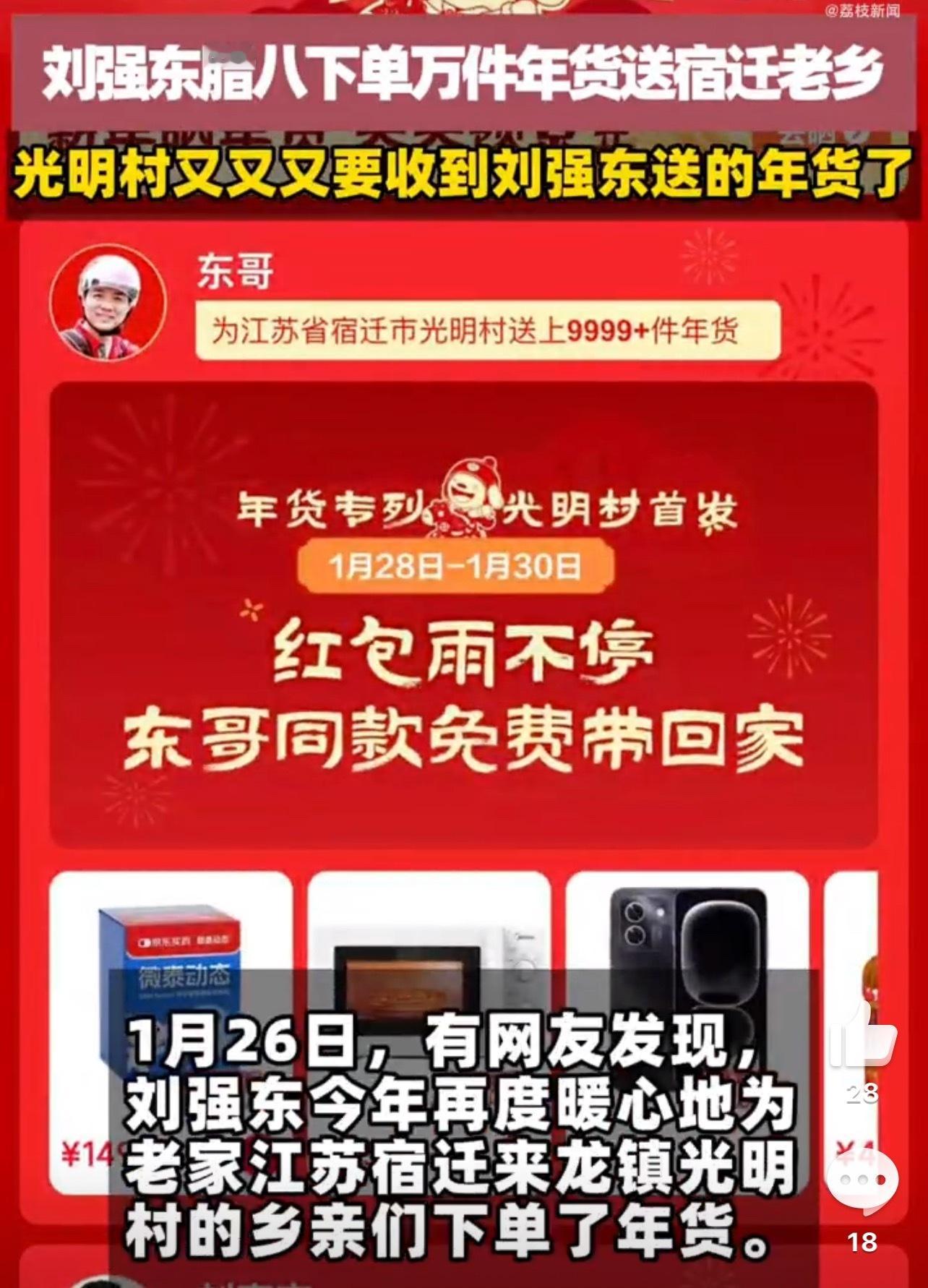 刘强东腊八下单万件年货送宿迁老乡 每年都有给老乡福利,真的懂得感恩! 光明村又又又要收到刘强东送的年货了