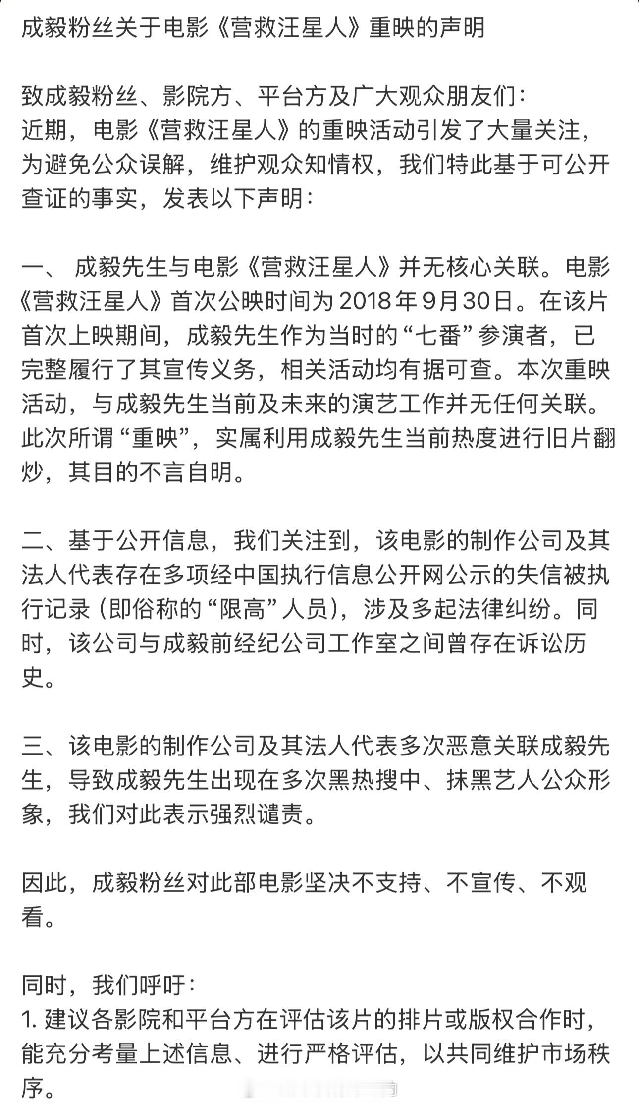 成毅粉丝关于电影《营救汪星人》重映的声明不宣传,不支持,不观看