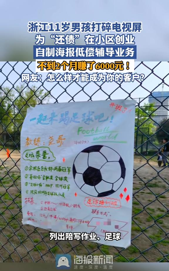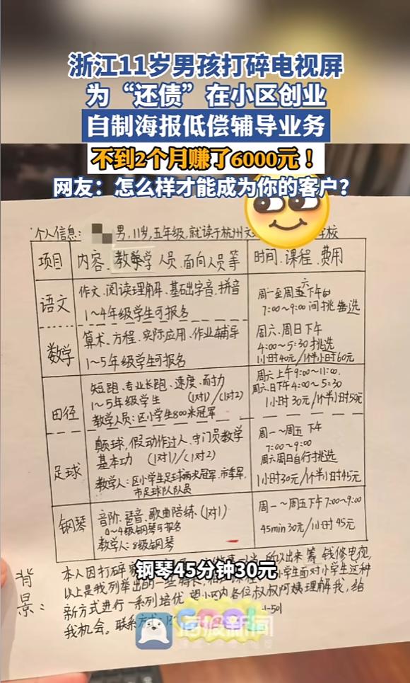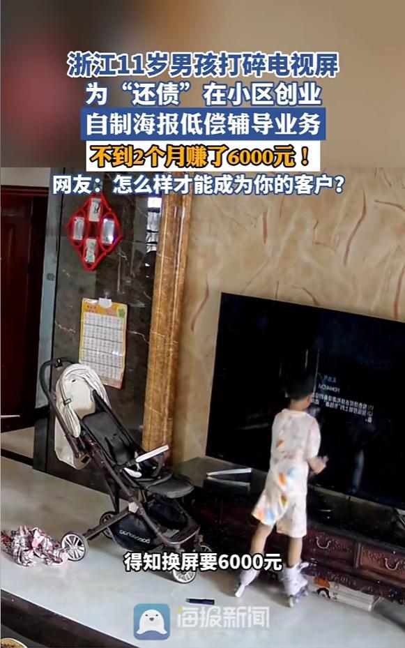 “人怎么能这么聪明!”近日,浙江,一男孩在玩耍时,不小心打碎家里电视屏,得知换屏需要6000块,男孩决定创业“还债”,他自制了一张服务海报招揽生意,小区里的叔叔阿姨纷纷捧场,不到两月就把钱凑齐了。网友:太有头脑了! 一声脆响之后,原本正在播放画面的液晶电视屏瞬间黑了下来,取而代之的是一道刺眼的、蜘蛛网般的裂痕。这一年,那名为众人称作“尧哥”的肇事者,不过是个尚在五年级求学的少年罢了。 一张厚重如铅的报价单横在他眼前,其上清晰写着换屏费用:六千元整。这数字似一记重锤,沉甸甸地砸在他心头。对于一个还在领零花钱的小学生来说,这不亚于一场小型的个人金融危机。 通常在这个节骨眼上,剧本会有两个走向:要么是一顿“竹笋炒肉”的皮肉苦,要么是家长一边叹气一边掏钱兜底。但这位杭州男孩按下了一个成年人都未必敢轻易触碰的按钮。他既没有撒泼打滚,也没有试图逃避,只是平静地扔出了一句硬邦邦的话:“一人做事一人当。” 这不是一句空洞的口号,因为紧接着,他启动了自己的“破产重组计划”。既然闯了祸,那就得把这一身的技能变现。尧哥没有选择去捡废品这种低效劳动,而是极其精准地对自己进行了资产盘点。 他手里的SKU(库存单位)相当丰富:作业辅导、足球陪练、田径陪练,甚至还有钢琴陪练。 但这还不是最精彩的,最精彩的是他的定价策略。在那个补习班价格不菲的2023年,他直接祭出了“价格屠夫”的大招:作业陪写,每小时40元。如果不小心超时到了一个半小时,那就收60元。 至于田径和足球这种体力活,更是低到了每小时30元的“白菜价”。 这个定价逻辑非常刁钻它精准地击中了小区邻居们的痛点。试想一下,只需花两杯奶茶钱,就能把家里那个令人头疼的“神兽”送出去,既解决了辅导作业时鸡飞狗跳的高血压风险,又能让孩子锻炼身体,这哪里是消费,简直是救命。 在这个商业闭环中,母亲程女士扮演了一个极其克制的角色。她没有直接替儿子买单,而是把自己变成了一个“渠道商”。她把儿子手绘的那张充满诚意、写着“恳请叔叔阿姨给我机会”的海报,发到了小区的业主群里。甚至在文案里,她都没有回避“打碎电视”这个略显尴尬的起因。这种坦诚,反而成了一种最好的信用背书。 市场反应是不会骗人的,信息刚发出去,邻居们的订单就像雪片一样飞来。尧哥的周末档期瞬间售罄,每天放学后的时间被填得满满当当。 但这孩子最让人细思极恐的地方,不在于他能赚钱,而在于他的商业嗅觉在实战中完成了进化。 起初,他只是单纯地“零售时间”,一对一地陪练。但他很快发现,这种单兵作战的效率太低,天花板太明显。 于是,一个大胆的想法冒了出来:与其一个个教,不如搞个足球俱乐部?说干就干。他不仅把简单的陪练升级成了团队活动,甚至开始琢磨招募助教和拉赞助的事。 你看,这就叫杠杆思维。从个体户到平台运营,很多成年人要在商海里扑腾好几年才能悟出的道理,他在那个五年级的暑假就玩明白了。不到两个月时间,账本上的数字最终定格。 那6000元巨款,真的被他一笔一笔地挣了出来。当他将那笔钱递到母亲手中,为手机换上新屏幕,此举完成的不只是债务的清还,更是一场关于独立人格的精彩呈现,似一场完美路演,踏出迈向成熟的坚定一步。 其实回头看,尧哥这种强悍的执行力并非从天而降。看看他背后的那位“天使投资人”——程女士的教育履历,你就会明白一切皆有迹可循。这就不是一个迷信说教的家庭。孩子沉溺游戏怎么办?她并未没收手机,而是带孩子前往游戏公司参观。在那里,孩子得以了解那些令人成瘾的代码逻辑,洞悉游戏背后深藏的商业算计。 孩子对法律好奇?她直接带去法庭旁听,让真实的审判锤音代替书本上的枯燥条文。就连假期旅游,也不是去网红景点打卡,而是把孩子扔到香港麦理浩径去徒步,或者去腾格里沙漠里吃沙子。 这种长期浸泡在“体验式教育”里的孩子,早就练就了一身解决问题的硬功夫。 所以,当那块屏幕碎裂的时候,尧哥的第一反应不是恐惧,而是计算解决方案。后来,社交媒体上对这件事的评价炸了锅。有人感叹这是“浙江人的经商DNA在觉醒”,也有人羡慕这是“别人家的孩子”。 但真正让人动容的,或许是邻居的那句评价:“性价比高,还解决了痛点。”在商业世界里,这是最高的赞誉。而在教育的世界里,这代表了一个11岁男孩,已经学会了像个成年人一样,在这个世界里有尊严地站立。 信息来源:《浙江11岁男孩打碎电视屏,为“还债”在小区创业,自制海报低偿辅导业务,不到2个月赚了6000元!网友:怎么样才能成为你的客户?》海报新闻