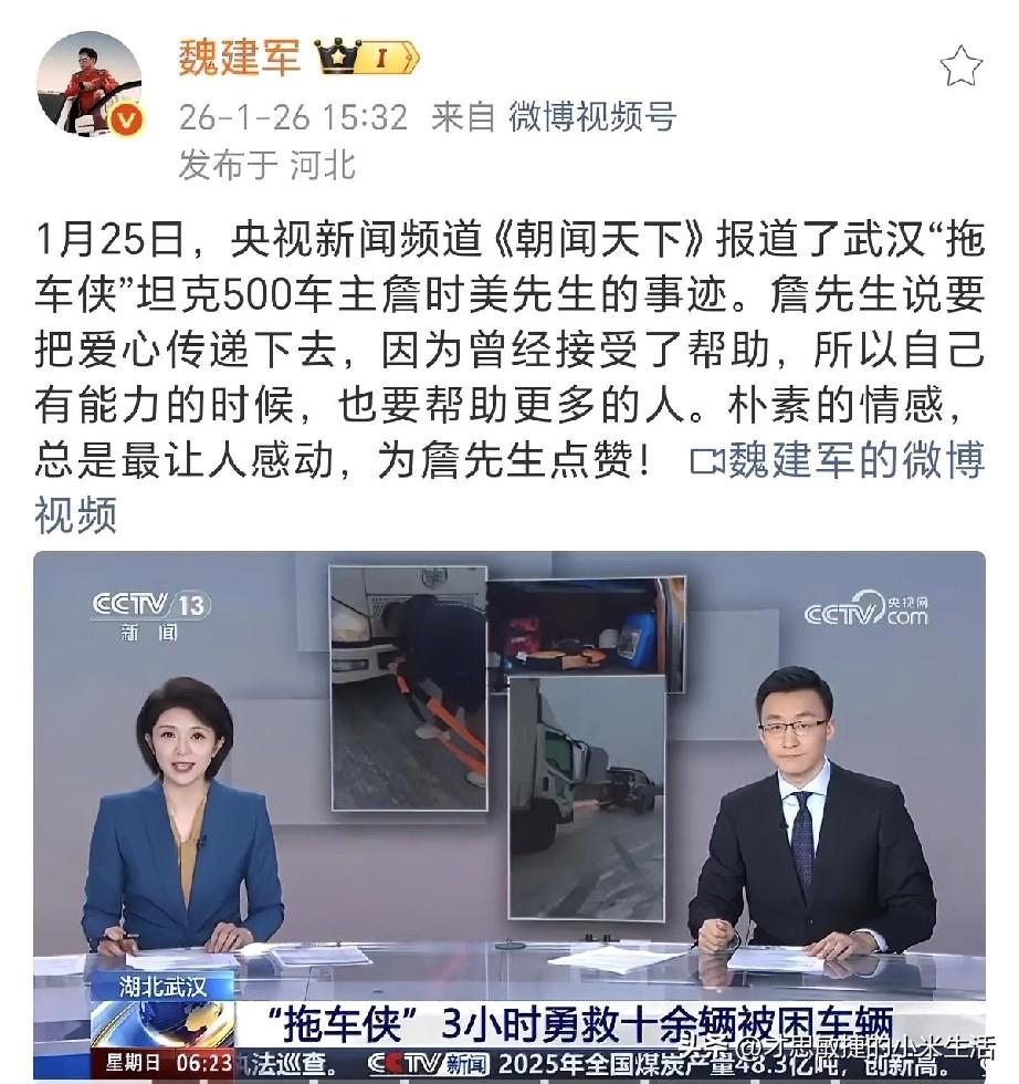 魏建军绷不住了! 坦克500车主和坦克汽车又上了央视! 前天,长城汽车魏总发视频致敬了这位武汉拖车侠,坦克500车主詹先生,魏总在视频里说刷到詹先生的视频非常感动。感谢张先生的见义勇为,因为这个冬天带来了温暖。 今天魏总再次发动态分享了1月25日,央视新闻频道《朝闻天下》报道了武汉“拖车侠”坦克500车主詹时美先生的事迹。魏总表示朴素的情感,总是最让人感动,魏总再一次为詹先生点赞! 原来詹先生的车曾深陷雪地4小时,也是一位陌生的越野车主将他救出,近一年来,他已义务救援了几十台车。寒冬里,总有一些人的善举令人暖心。从被救者到施救者,詹先生用一根拖车绳在冰雪路面上划出了一道道温暖的爱心轨迹。网友表示这也许就是坦克越野精神吧!你们怎么看?