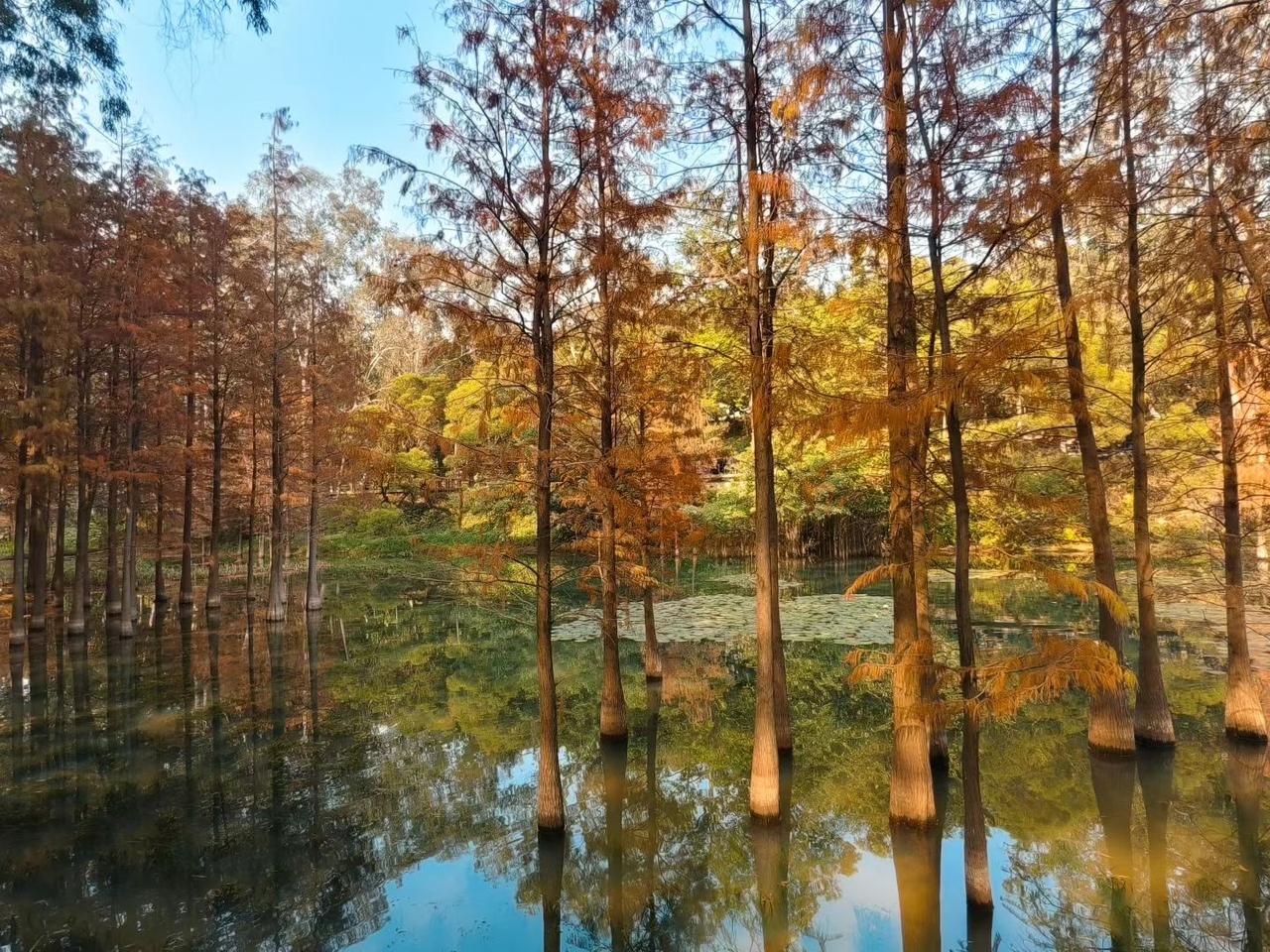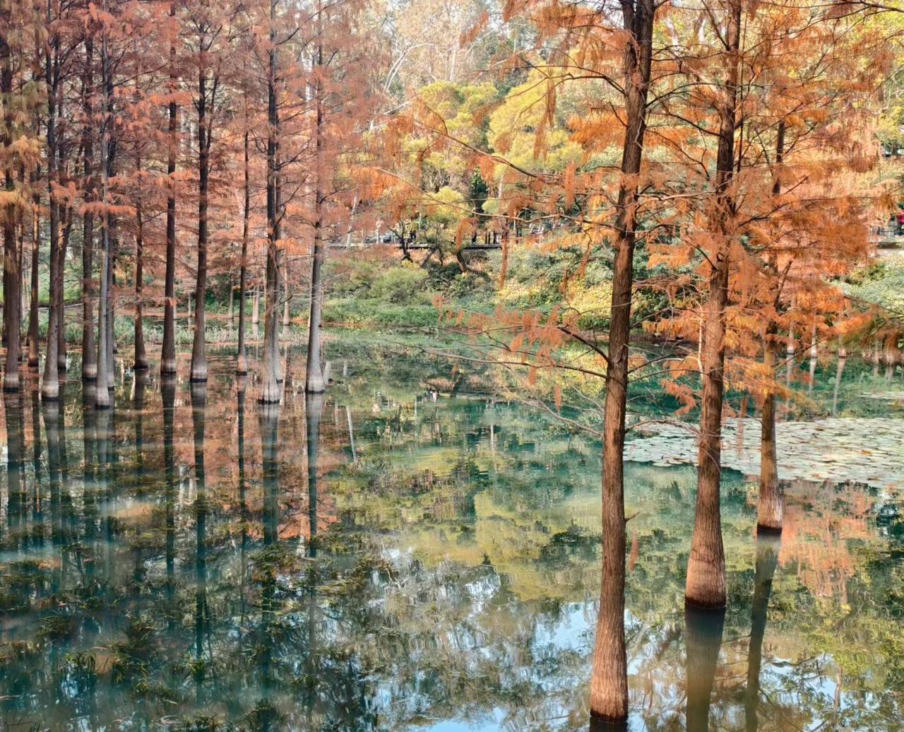 广州麓湖公园的景致,宛若一幅徐徐展开的水墨丹青。湖面如素笺平铺,百年古榕虬枝临水,树影似淡墨晕染,红褐的落羽杉映于碧波,为青灰画卷点染灵动色彩。水草轻摇晕开一池青绿,水鸟掠水,恰似画中留白处的点睛之笔。远山含黛,亭桥隐于林麓,晨光薄雾轻笼时,山水相融,墨色浓淡相宜,行走其间,便如入写意山水间,尽赏岭南水墨的温婉诗意。 广州麓湖