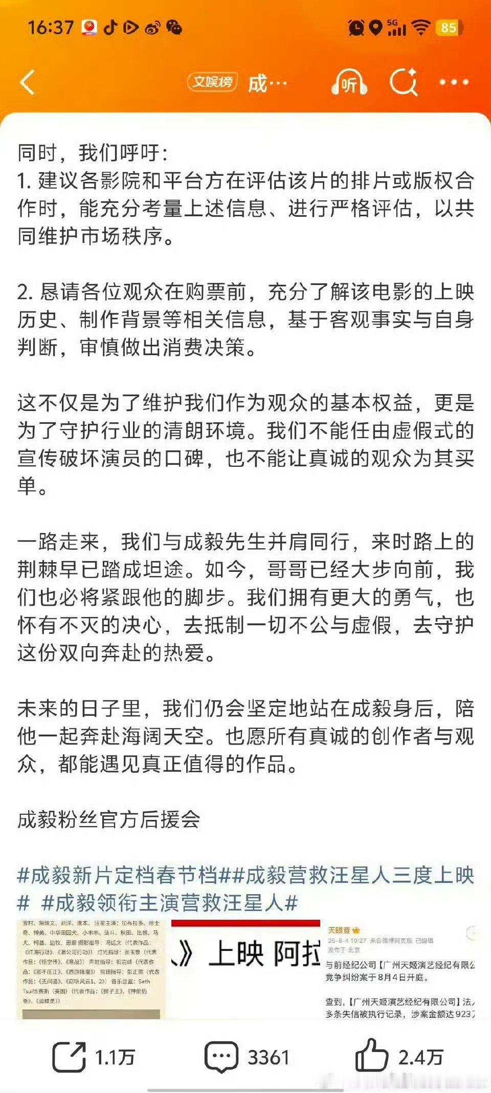 成毅粉丝就新电影发声明成毅粉丝拒绝观看营救汪星人诚成毅粉丝集体抵制其新电影,不
