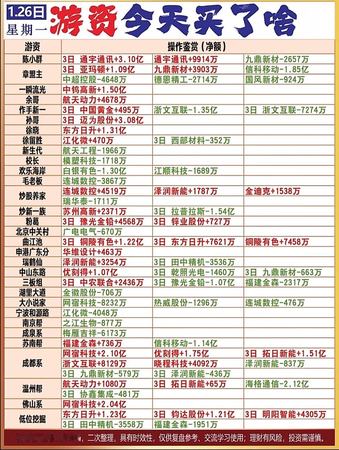 1月26日游资今日操作赏析:谁在买入谁在卖出? 游资动向:多股大额进出,东方日升、网宿科技获青睐,信科移动遭抛售,市场分歧明显,投资需谨慎。