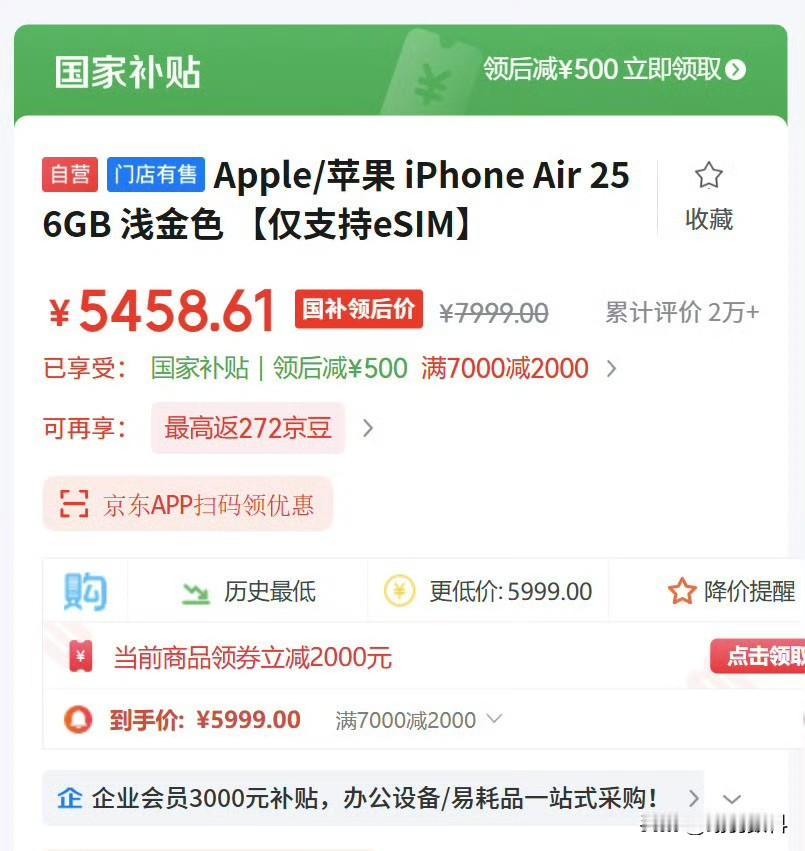 5458元 已是iPhone 17 Air全网最低价格 这样的价格 对真正的果粉颇具吸引力 定会助推苹果17 Air销售增长 但反过来问 苹果为何降价加国补近2500元 原因很简单 销量差得离谱 苹果也不打算大规模生产iPhone 17 Air 毕竟销量如此拉垮 大规模生产已无必要 而且 这款手机成本显然最多3000元 苹果降价2000元后 单机利润仍可达2000元 可想而知 苹果利润有多恐怖 苹果17系列