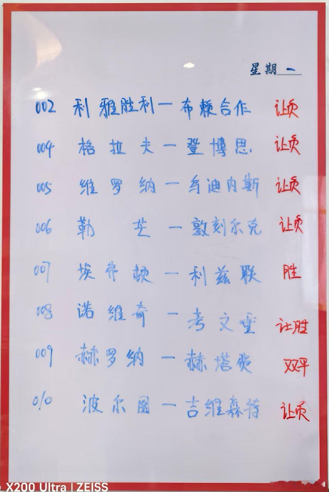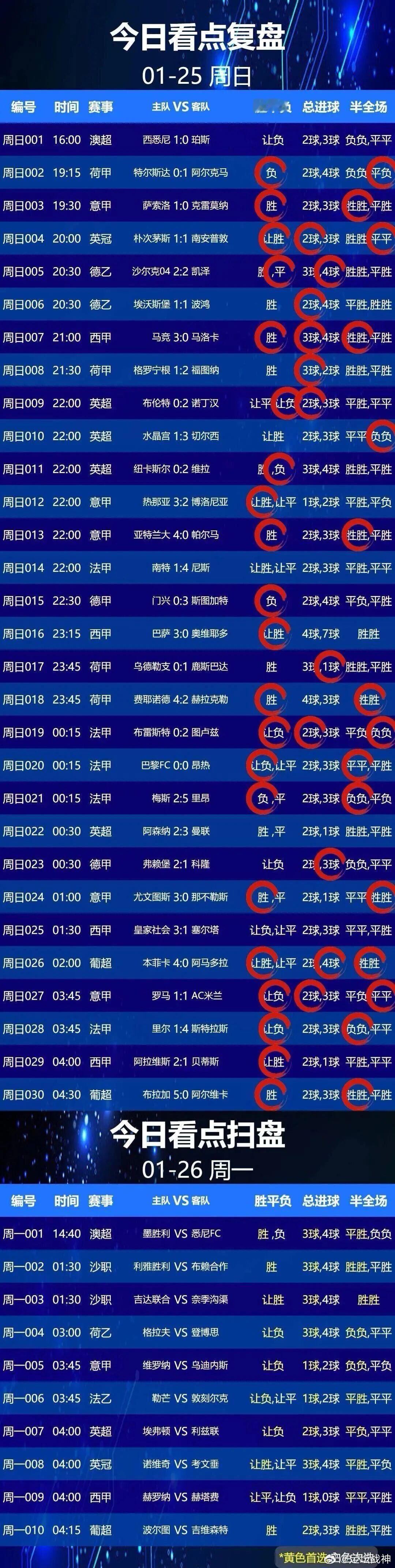 1月26日001 墨尔本胜利 VS 悉尼 FC002 利雅得胜利 VS 布赖代合作 003 吉达联合 VS 阿赫杜德004 格拉夫夏普 VS 登博思005 维罗纳 VS 乌迪内斯
