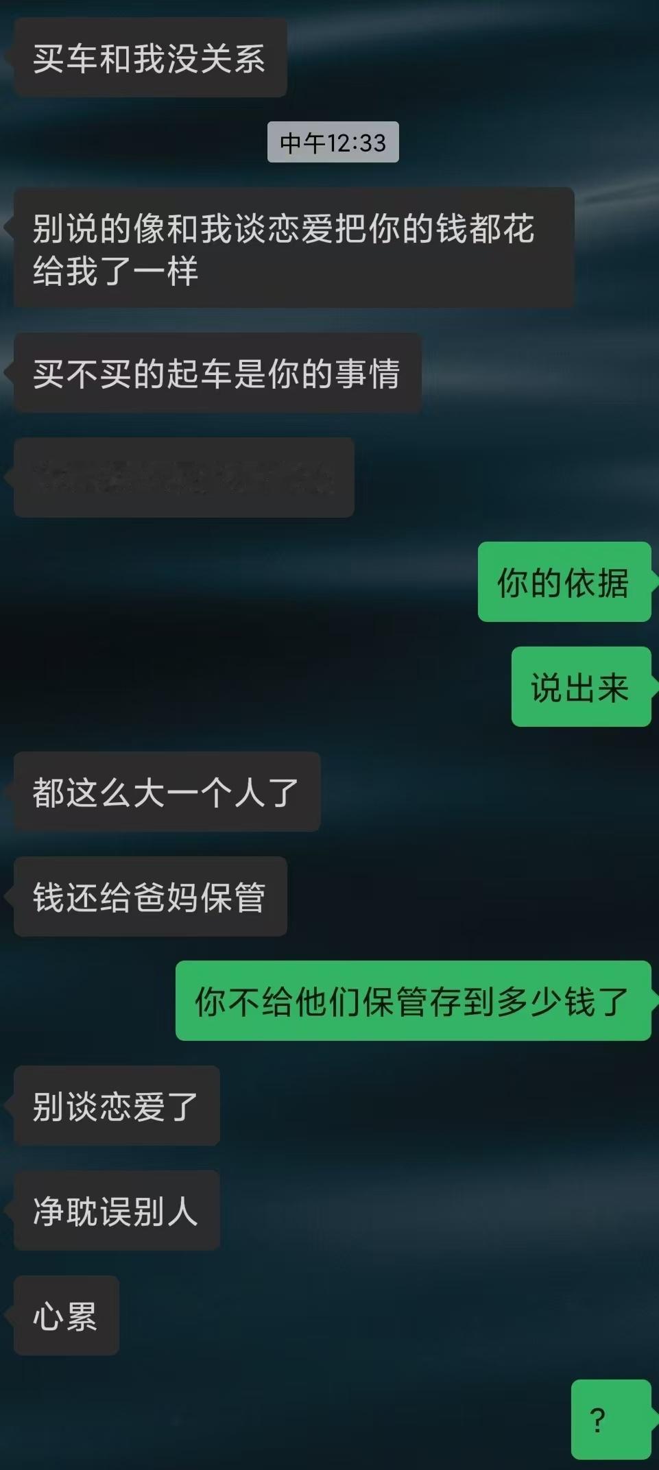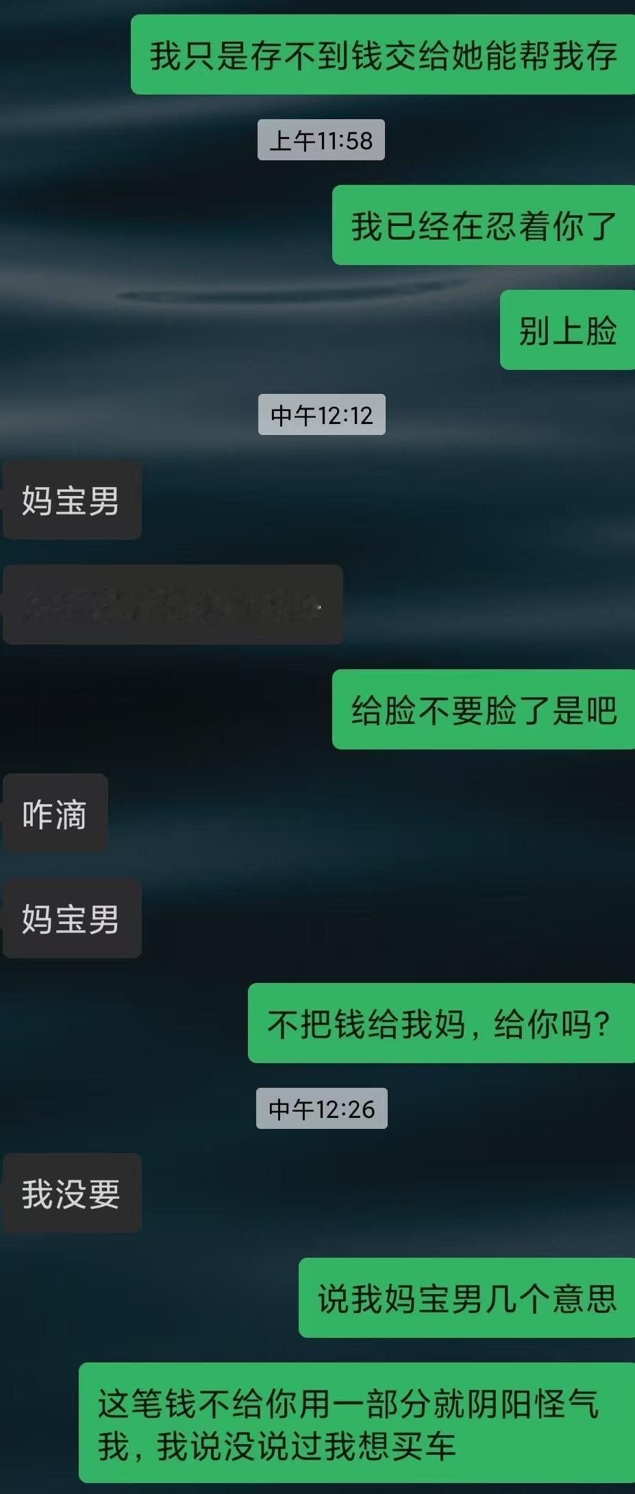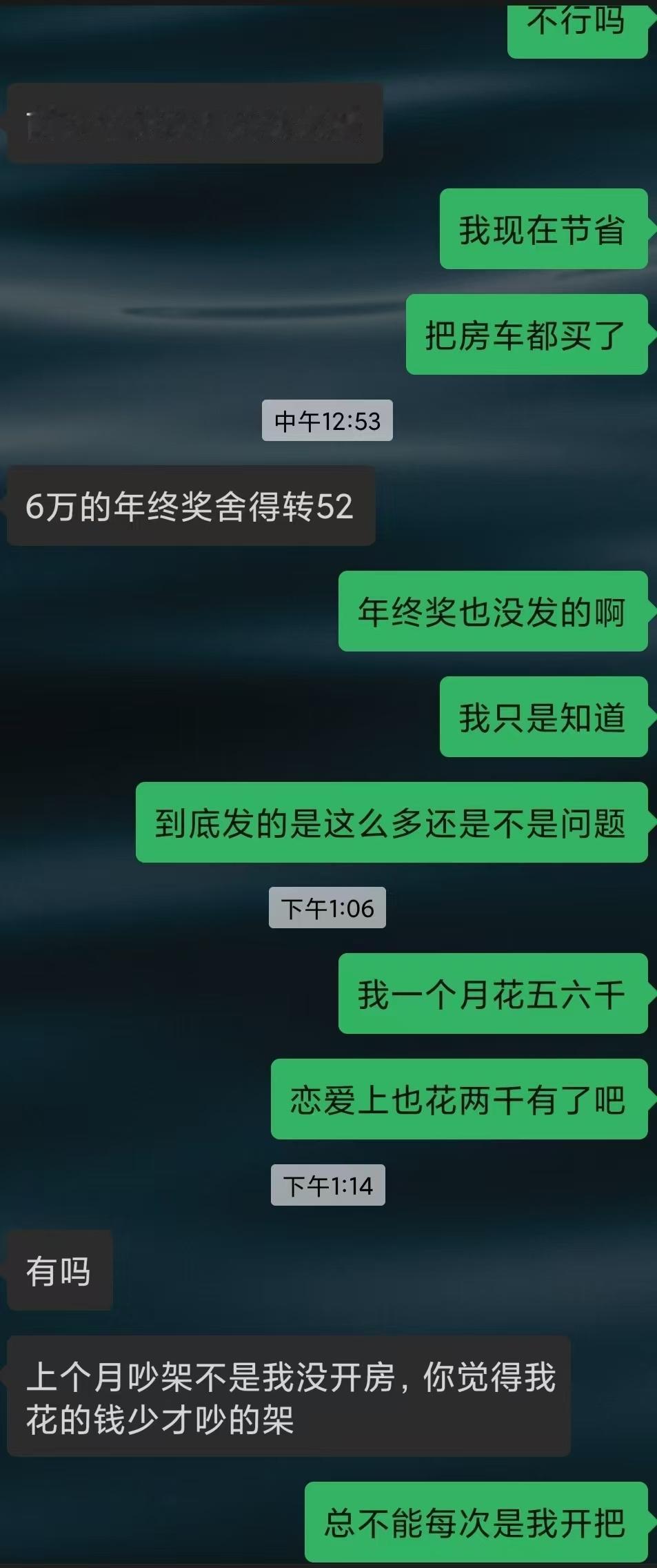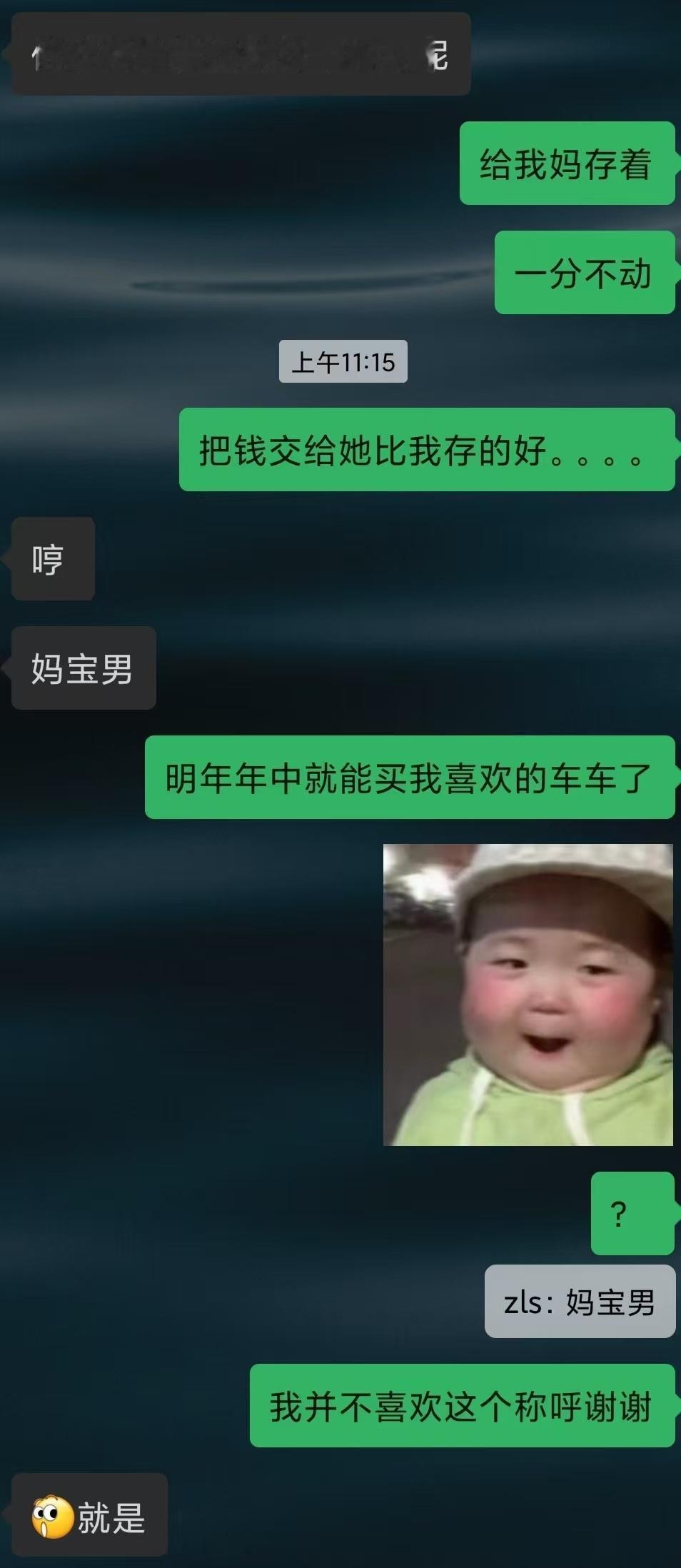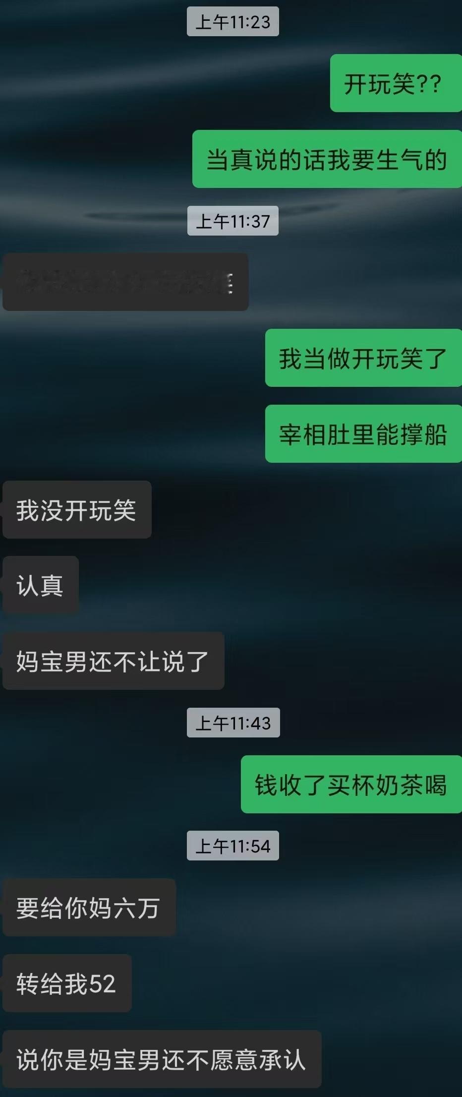 单身挺好的,要不别谈了… 近日,一男网友年终奖有6万块,于是他跟女朋友分享这个开心的事,还慷慨的给女朋友转52块! 女朋友问他计划这钱怎么用,他说他要转给妈妈替他保管,计划过完年再存几个月就可以买车了! 结果女朋友说他是妈宝男,他觉得自己被侮辱了,于是和女朋友吵了起来… 男方属实是有点抠,但也不是妈宝,钱交给父母存在也没啥问题,不过前脚才炫耀年终奖6万,后脚就转52块,这52块还不如不转,还有最后两句话,真是坐实了男方真的抠… 不过他自己肯定不觉得,不然也不会放出聊天记录试图让网友们替他说教一下女朋友了….