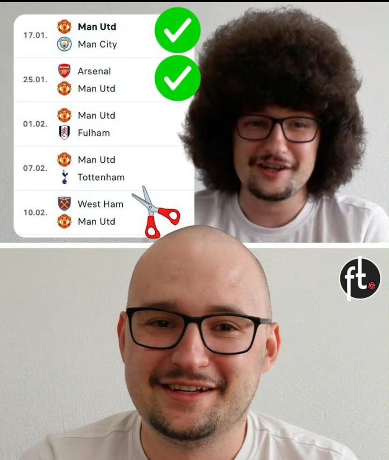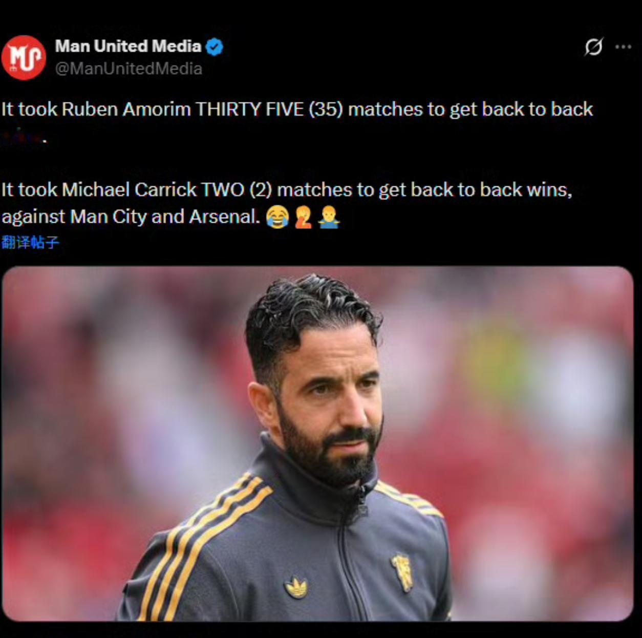 【进度2/5】曼联五连胜才理发的“蓄发哥”距离理发还差三场胜利!阿森纳2比3曼联 ✅曼联2-0曼城 ✅阿森纳2-3曼联 ⏳主场vs富勒姆 ⏳主场vs热刺 ⏳客场vs西汉姆联 【炒晚了?】曼联球迷发帖:阿莫林用了35场比赛才取得连胜,而卡里克只用了两场,对手还分别是曼城和阿森纳。阿森纳2比3曼联