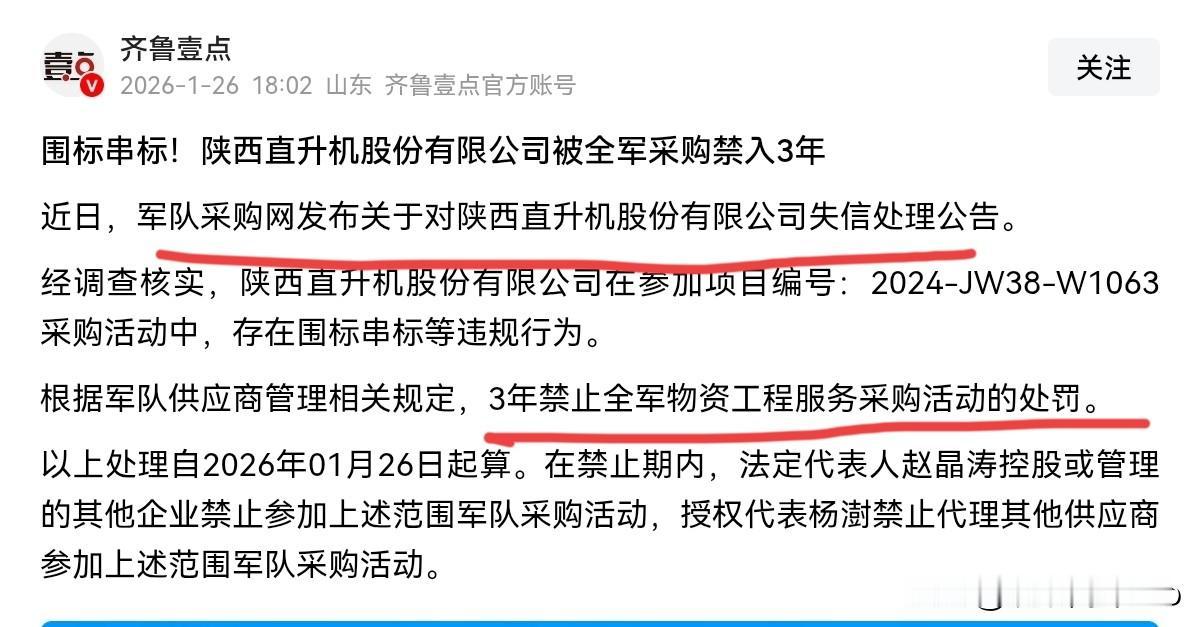 胆大包天!我们国家军队内部反腐打贪力度这么大,竟然还有人顶风作案,在军用装备采购方面搞围标串标!1月26日,根据国内媒体报道,近日,军队采购网发布关于对陕西直升机股份有限公司失信处理公告。该公告显示,该公司在涉及军方的采购活动中,存在围标串标等违规行为。 我们有关部门根据军队供应商管理相关规定,对该司作出处罚,禁止其3年内不得参与全军任何物资工程服务的采购活动。我们国家涉及军队的反腐打贪力度如此巨大,没想到现在还有人顶风作案。那么何为围标串标呢?所谓围标,就是一家企业牵头联合多家企业形成“围标联盟”,通过故意抬高或压低报价、内定中标方,排挤其他竞标者。 何为串标呢?那就是买方与买方相互勾结,相互串通,提前泄露标底、设定排他性条件等,通过不正当手段操控招投标结果。很显然,这样的事件性质非常的恶劣。如果是围标,极有可能导致的情况是导致装备采购成本升高,装备质次价高,这直接影响部队战备训练和装备战斗力。如果是串标,这往往伴随这权钱交易、利益输送。 在这样的勾兑中,不仅破坏军队风气,而且还会导致优质企业被排挤在外,长此以往,这必然会削弱我国军工整体的实力。很显然,对于这样的违规,乃至犯罪行为,我们国家要出重手整治打击,刹住这种不良风气。大老虎要打,苍蝇,臭虫也不能轻易放过。