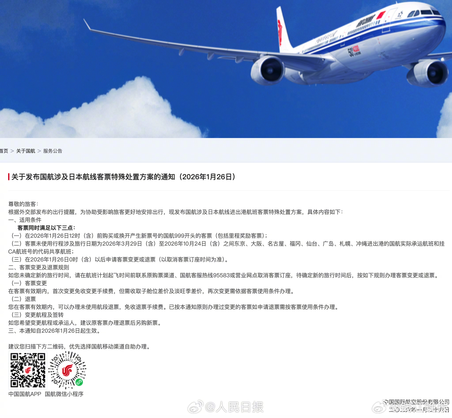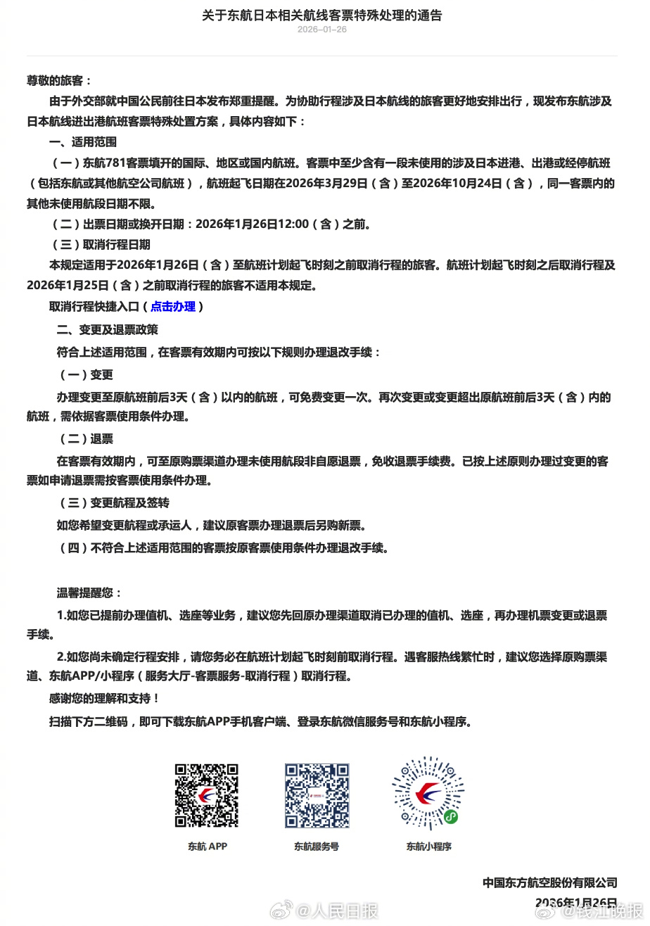 #49条中日航线取消全部航班#【 #多家航司调整涉日航线免费退改政策# 】1月26日,国航、东航、南航三大航以及山航、厦航、上航等多家航司发布关于日本相关航线客票特殊处理的通告。公告均指出,根据外交部发布的出行提醒,为协助受影响旅客更好地安排出行,现发布涉及日本航线进出港航班客票特殊处置方案。#中国公民春节期间避免前往日本#国航公告指出,在2026年1月26日12时(含)前购买或换开产生新票号的国航999开头的客票(包括里程奖励客票);客票未使用行程涉及旅行日期为2026年3月29日(含)至2026年10月24日(含)之间东京、大阪、名古屋、福冈、仙台、广岛、札幌、冲绳进出港的国航实际承运航班和挂CA航班号的代码共享航班;在2026年1月26日0时(含)以后申请客票变更或退票(以取消客票订座时间为准),在客票有效期内,首次变更免收变更手续费,但需收取子舱位差价及淡旺季差价,再次变更需依据客票使用条件办理。在客票有效期内,可以办理未使用航段退票,免收退票手续费。东航此次公告指出,办理变更至原航班前后3天(含)以内的航班,可免费变更一次。再次变更或变更超出原航班前后3天(含)内的航班,需依据客票使用条件办理。在客票有效期内,可至原购票渠道办理未使用航段非自愿退票,免收退票手续费。南航此次公告指出,客票变更首次变更至相同航程的南航实际承运航班,免收变更费,如发生票价价差按规定收取。再次变更需依据客票使用条件办理。退票在客票有效期内申请退票,免收退票费。据悉,2025年10月26日至2026年3月28日为2025/26冬春航季。2026年3月29日至2026年10月24日为2026/27夏秋航季。此次集体公告,意味着日本航线免费退改签政策延长至今年夏秋航季。多家航司已于2025年11月15日发布日本航线客票处理通知,2025年12月31日前日本进、出港(含经停)的航班免费退改签。2025年12月5日,多家航司再发布调整涉及日本航线客票特殊处置方案的通知,2026年3月28日(含)前出行的涉及日本进港、出港或经停航班可免费退改。已有多家国内航司取消或计划取消赴日航班。有航司人士此前向澎湃新闻指出,赴日航线的调整要看市场需求,航司目前仍在跟踪和评估旅客的退改签情况。此前,日本新任首相高市早苗涉台问题的错误言论在中日两国及国际社会引发广泛关注和强烈批评,多名日本国会议员要求高市早苗撤回相关言论。去年底,外交部和中国驻日本使领馆郑重提醒中国公民近期避免前往日本。(澎湃新闻 记者 邵冰燕)