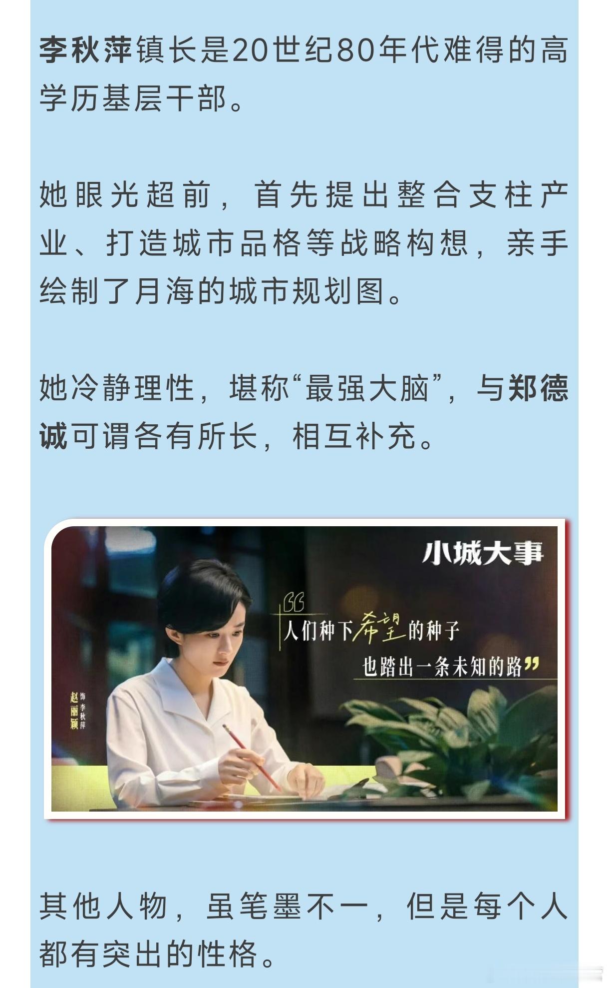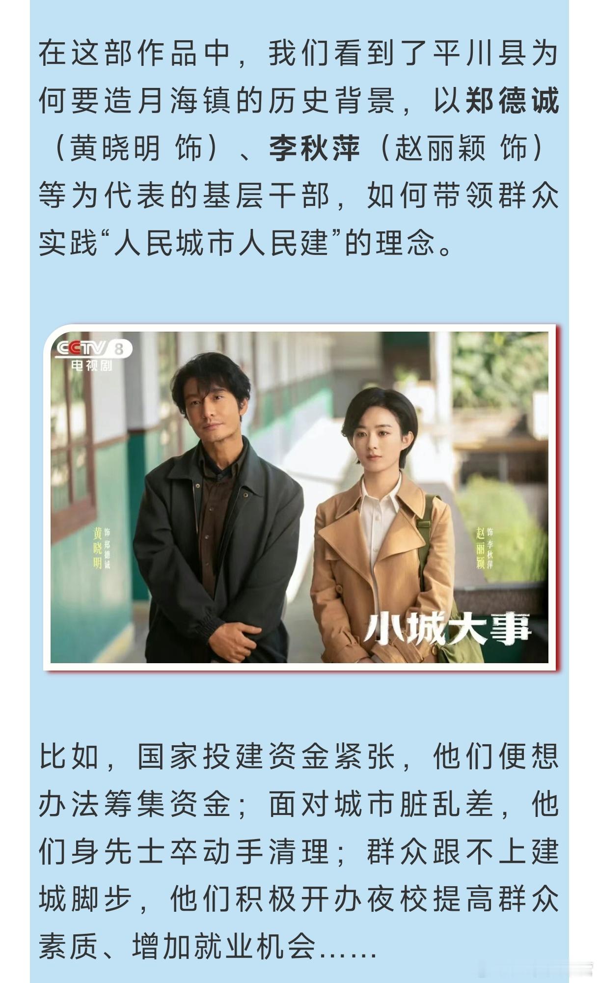 央视剧评—《小城大事》:好一幅造城治城的火热画卷——文艺是时代前进的号角。总台央视电视剧频道在新年伊始、新春即将到来之际排播这样一部精彩的“创业剧”,拉开“十五五”征途的大幕,不仅点燃了全民共欢、昂扬向上的热烈氛围,更激发了一股干事创业的精气神,体现了重要的时代价值。小城大事赵丽颖李秋萍