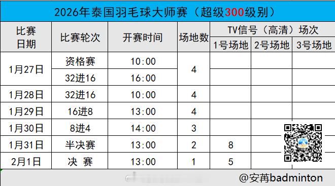 2026年泰国羽毛球大师赛首日赛程出炉(图1)完整签表(图2)开赛时间(图3)🟣本站最终退赛人员男单:骆建佑🇸🇬、金廷🇮🇩女单:碧查梦🇹🇭混双:希达亚图拉/费利沙🇮🇩🟣一号场地(10:00🕙资格赛/16:00🕓正赛)13 陈旭君/刘阳🇨🇳 vs 通萨/查能蓬🇹🇭🟣二号场地3 朱轩辰🇨🇳 vs 阿尔卡拉🇺🇸(资格赛)10 黄荻/孙文骏🇨🇳 vs 赖柏佑/蔡富丞ᴛᴘᴇ🟣三号场地4 董天尧🇨🇳 vs 小川翔悟🇯🇵(资格赛)10 罗徐敏/王漪朵🇨🇳 vs 许雅晴/宋祐媗ᴛᴘᴇ14 李怡婧/鲍骊婧🇨🇳 vs 鲁塔帕尔娜/斯威达帕纳🇮🇳🟣四号场地7 陈永锐/陈喆涵🇨🇳 vs 吕俊玮/洪魁骏🇭🇰(资格赛)13 坑姝良/李华洲🇨🇳 vs 大泽佳步/田部真唯🇯🇵🟣直播地址:中国羽毛球协会公众号&视频号/优酷等🟣实时比分:网页链接🌟羽球🏸观赛聊天群:羽你一起来看球🌟综合体育🏟️聊天群:综合体育畅聊群🌟欢迎你的加入,一起开心^O^看球,聊球! 羽毛球运动打卡