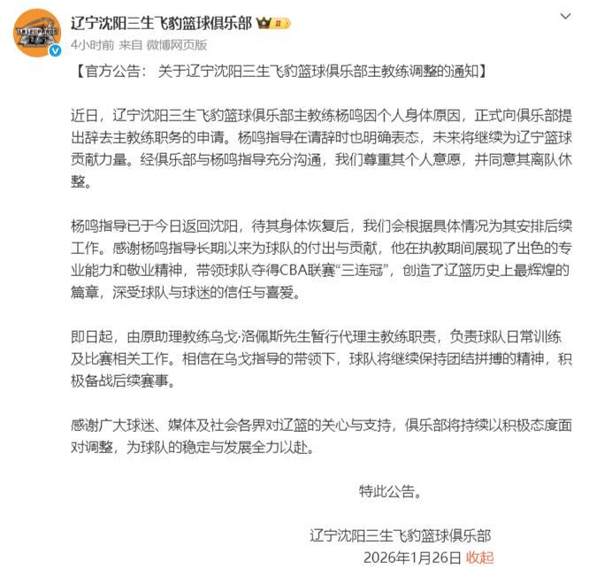 辽宁男篮俱乐部和杨鸣今天齐发声,从俱乐部和杨鸣的发言中可以看出后续的几点可能: 1、杨鸣只是暂时休息。 2、杨鸣不会离开辽宁男篮。 3、俱乐部给杨鸣留着位置,等他休整好就可以回来。 杨鸣今天对于自己辞去辽宁男篮主教练这件事情发声,杨鸣在自己的微博上说最近球队的表现真心对不住球迷的支持,让大家失望了,非常内疚和惭愧,感谢球员的支持和俱乐部的信任。辽宁男篮一定会更好。 从辽宁男篮俱乐部的官方声明中可以看出俱乐部在极力挽留杨鸣,但杨鸣现在身心俱疲想要休息一阵,俱乐部也表示杨鸣休整一阵还会继续为辽宁男篮工作,并给他安排工作。 这说明杨鸣只是暂时的离开,估计休息一段时间,在合适的时机杨鸣还会回来的。