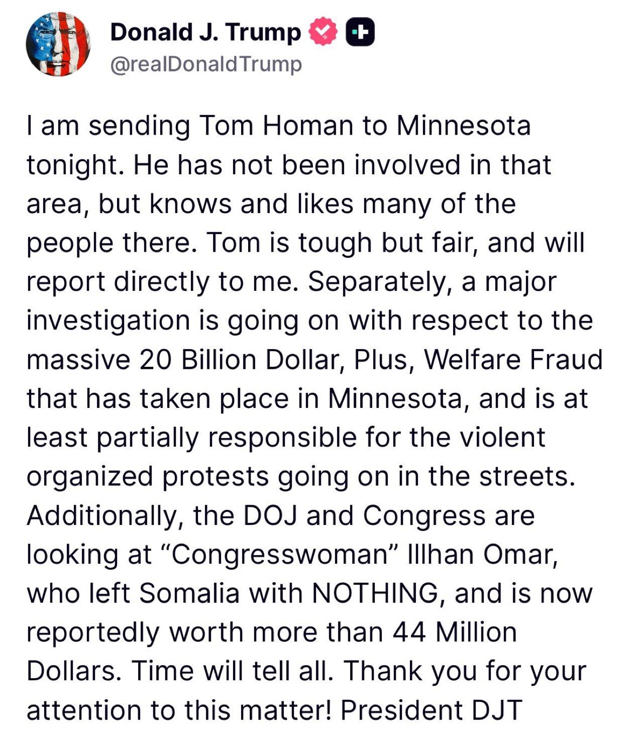 新闻快讯——【特朗普再掀明尼苏达风波】 前总统特朗普宣布派遣强硬派移民执法官员汤姆·霍曼赴明尼苏达,直指当地200亿福利欺诈是抗议根源,并曝司法部和国会正调查索马里裔女议员奥马尔身家暴增问题。 此举被指借敏感事件进行政治操弄,多项指控均缺乏公开实锤。