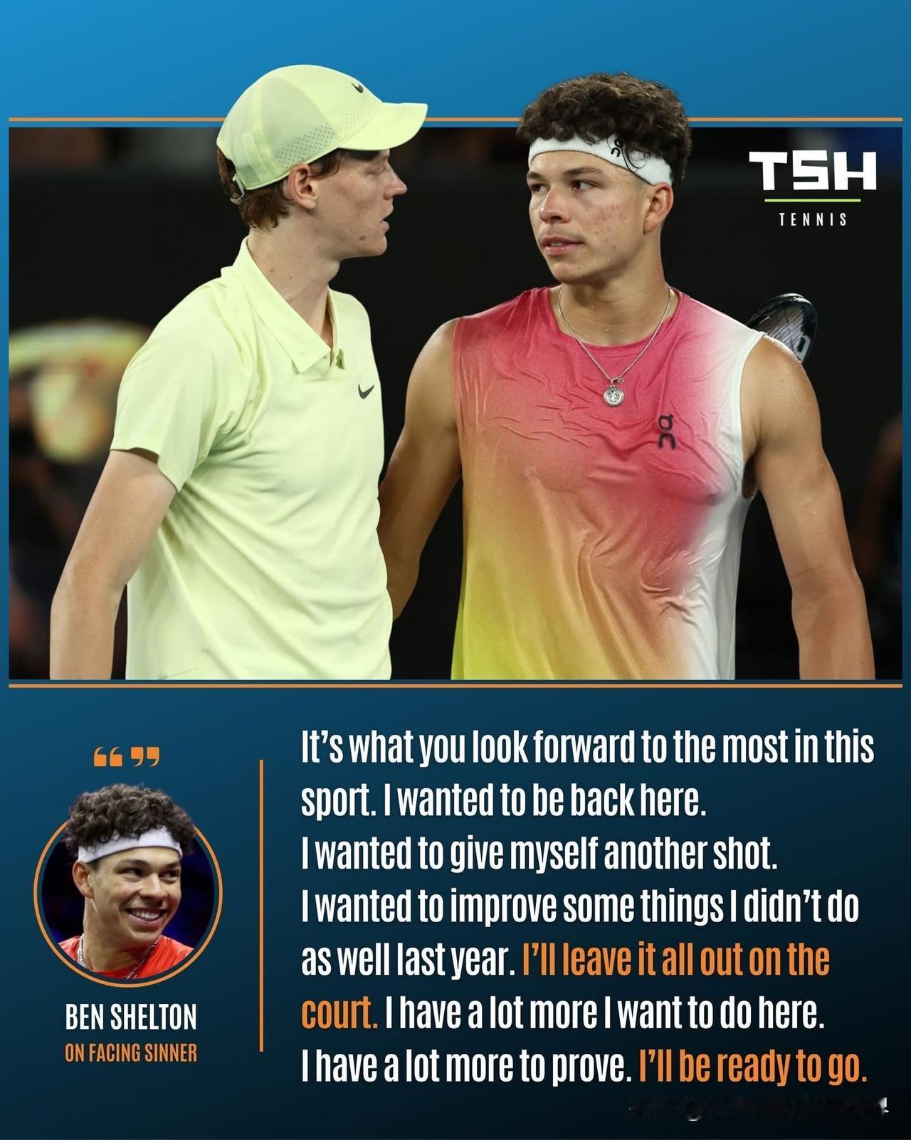 谢尔顿击败鲁德赛后采访谈到接下来即将面对卫冕冠军辛纳:“这是这项运动中最令人期待的部分,我想回到这里,我想再给自己一次机会。我想改进一些去年做得不够好的 地方。我会在球场上全力以赴,我在这里还有很多想做的事情,我还有很多需要证明。我会做好准备。” 本·谢尔顿斗志昂扬,准备大展身手!但面对辛纳光有信心和斗志是不够的,那么他能做到阻止辛纳吗?
