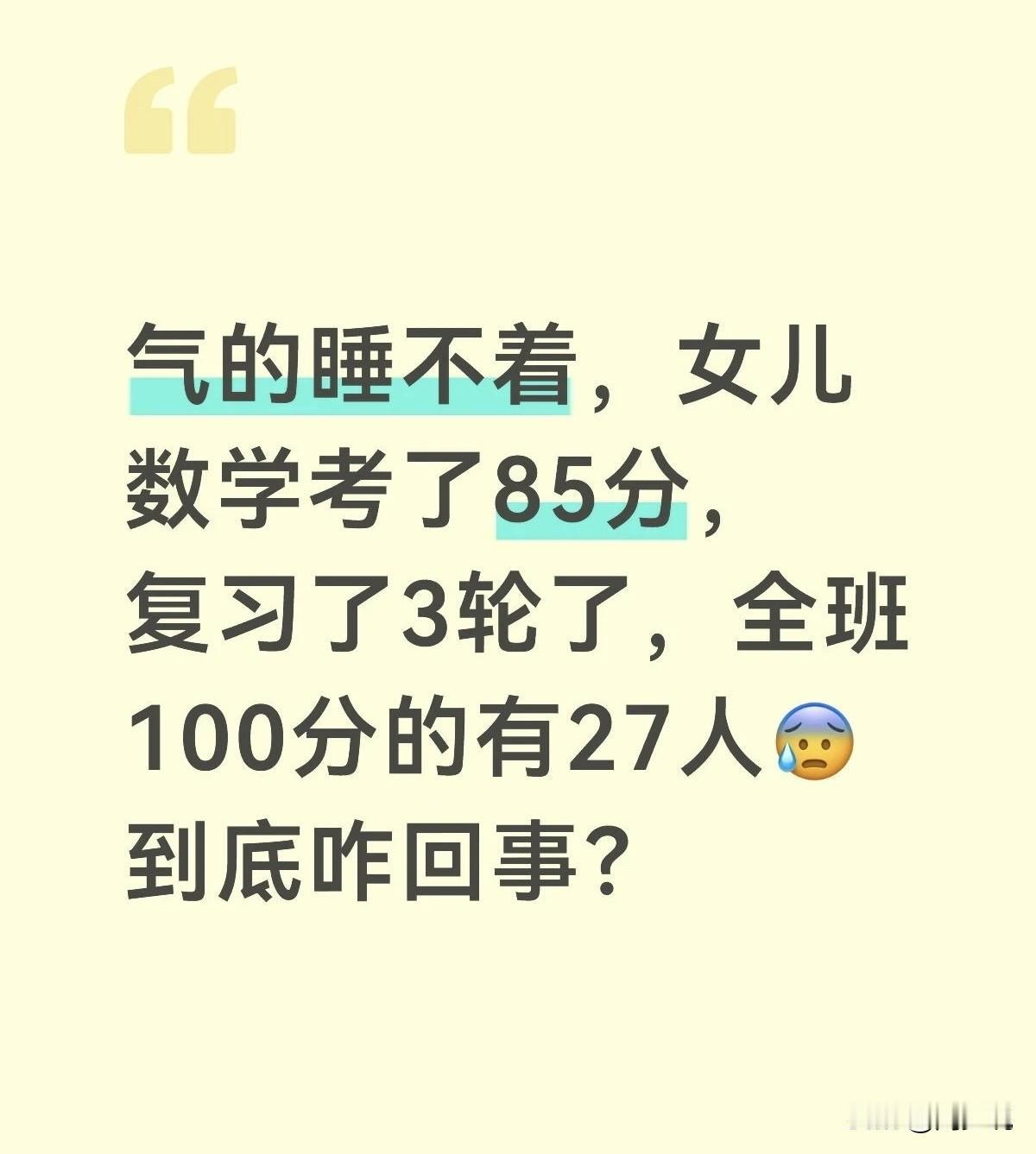气归气,但还是奉劝这位家长保持好心态,数学这门功课真的看智商,智商不够,考85分太正常不过了。说个真实的案例,一个同学,其它科目一般,唯独数学特别好,平时也没怎么学,上课正常听,但每次考试成绩都特别好。所以,别过于较真了,坦然接受平庸吧….#寻美三湘# #长沙新朋友#