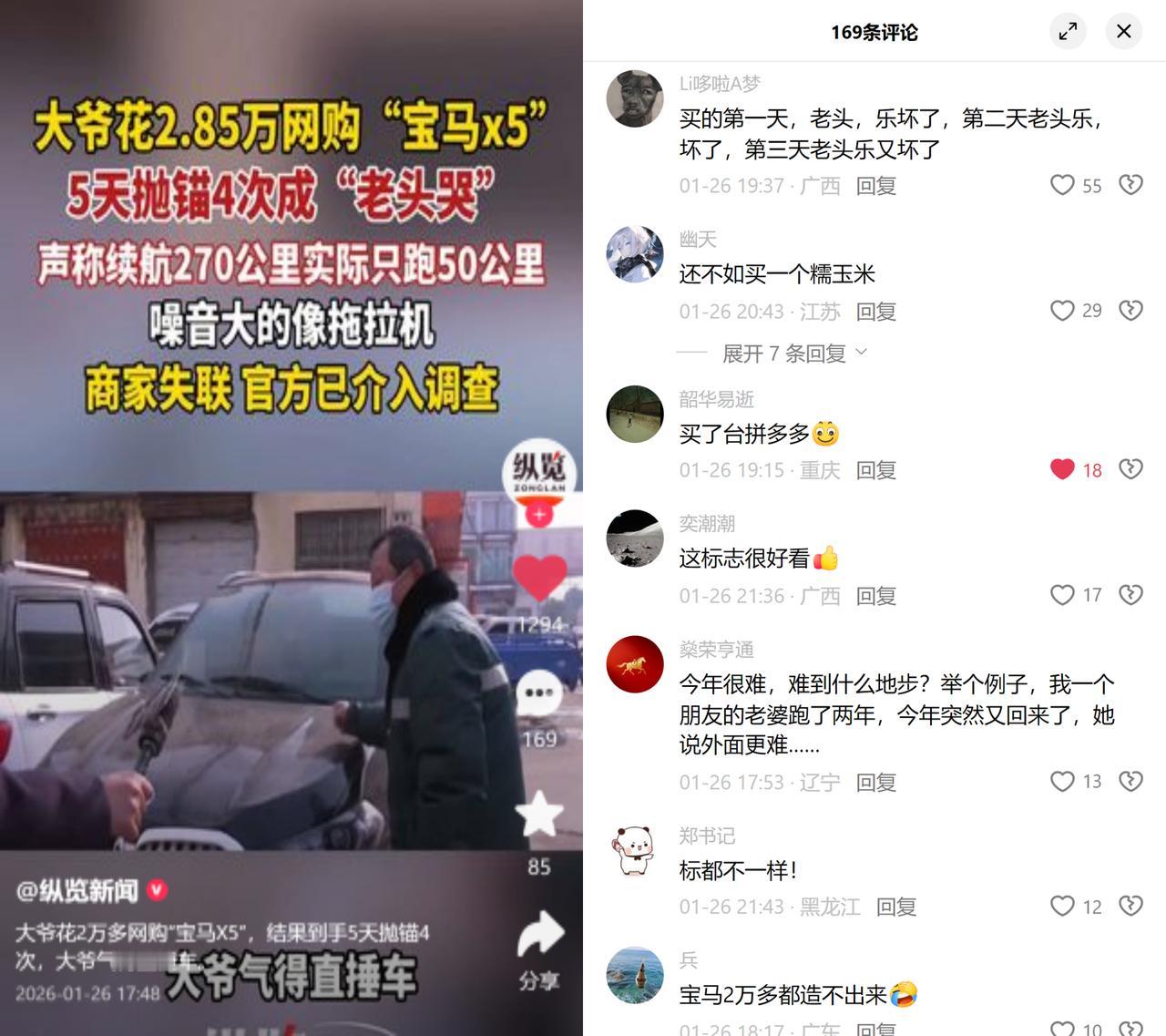 70岁大爷花2万多买宝马X5,结果差点气坏! 到手5天抛锚4次,宣称续航270公里实际只跑50,噪音大得像拖拉机,找商家直接失联,气得大爷直锤车。 这哪里是买代步车,分明是买了个闹心疙瘩。这事并非个例,下沉市场里的老头乐乱象早就藏不住了, 低价噱头勾人,参数全靠瞎吹,售后更是失踪人口。专抓老人图实惠、不懂甄别信息的心理,把假大牌、虚标续航玩成了行业套路。 说白了,归根结底是靠谱的低价代步选项太少。什么时候这些乱象能被彻底管管?