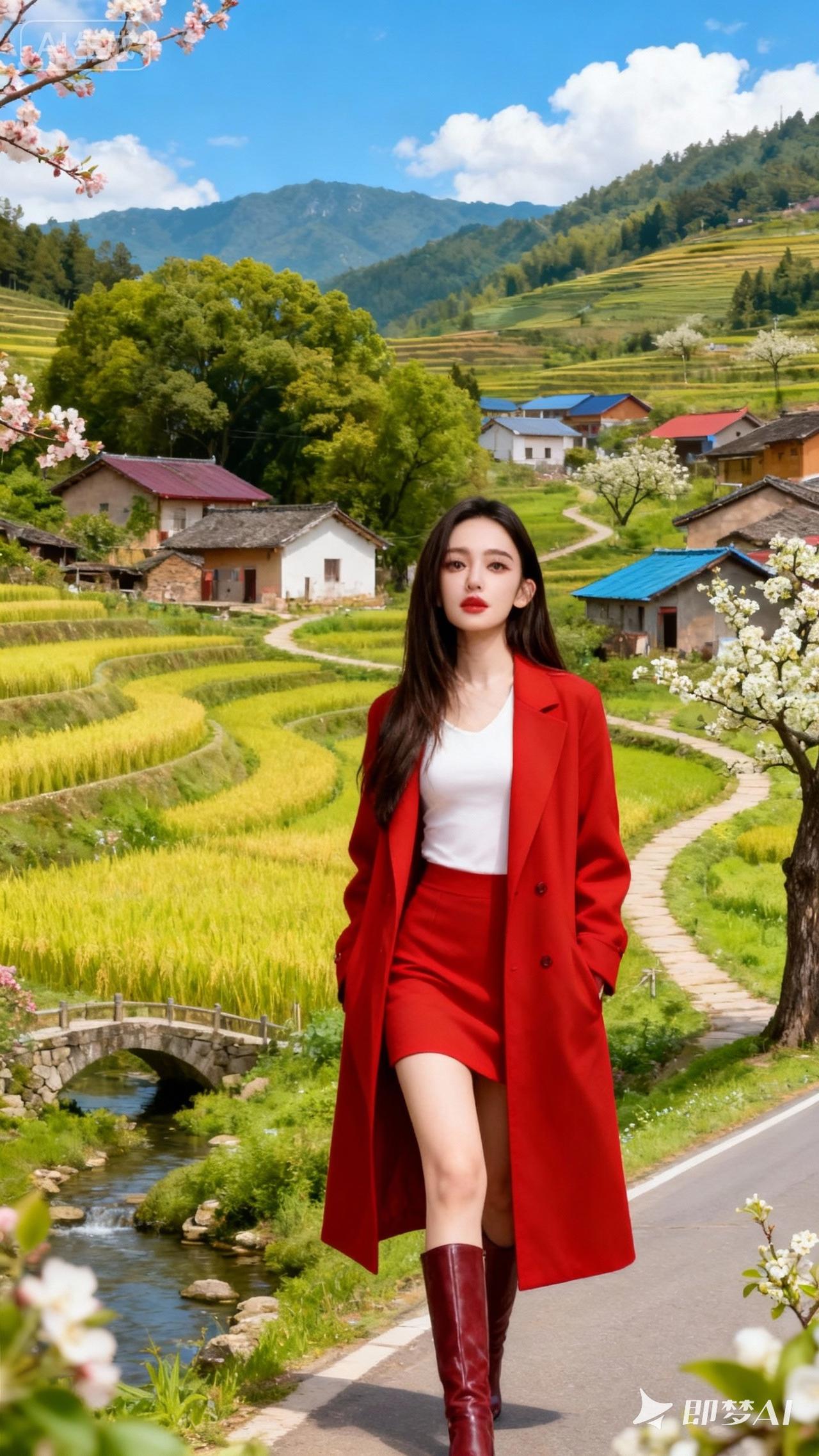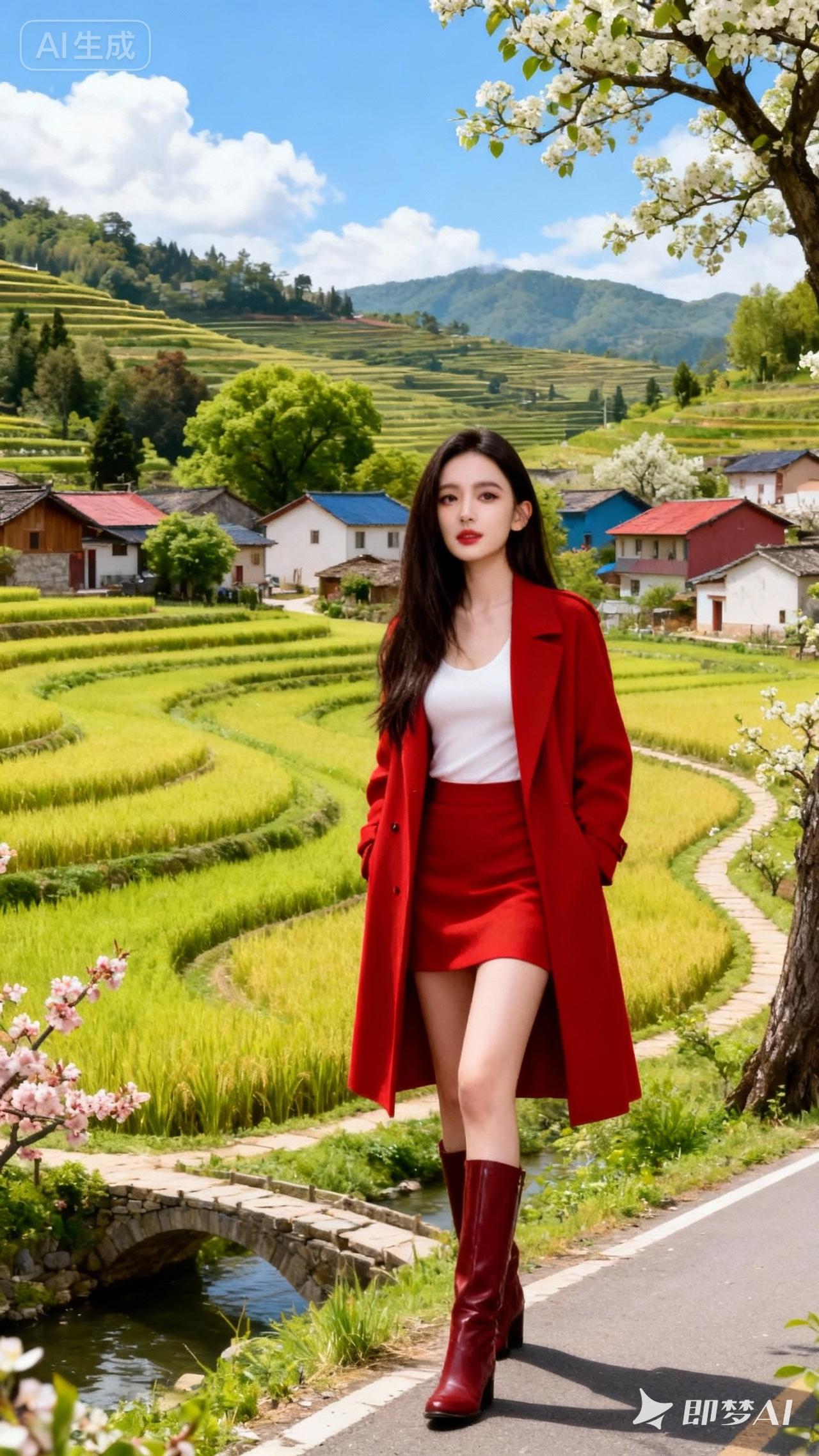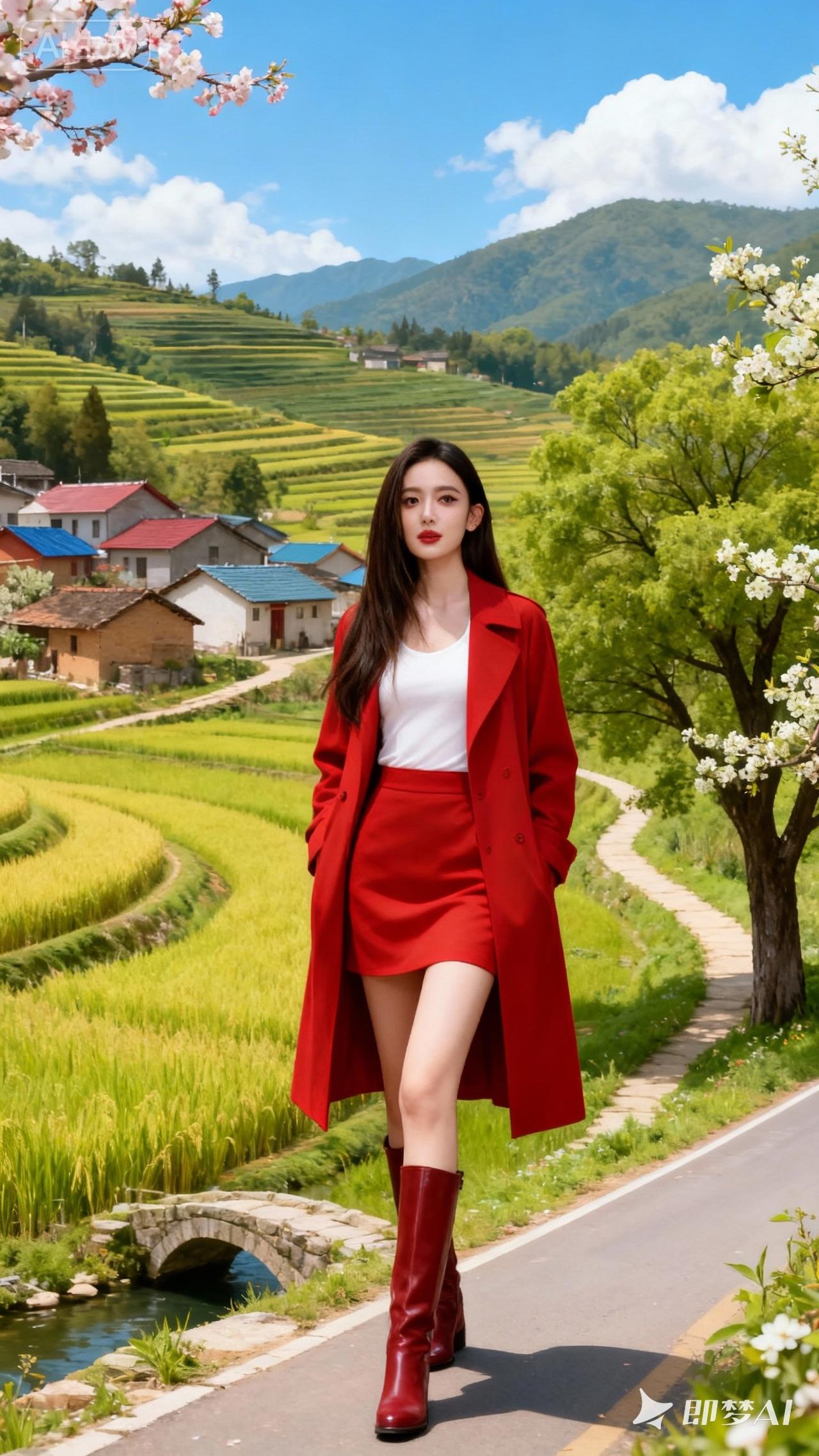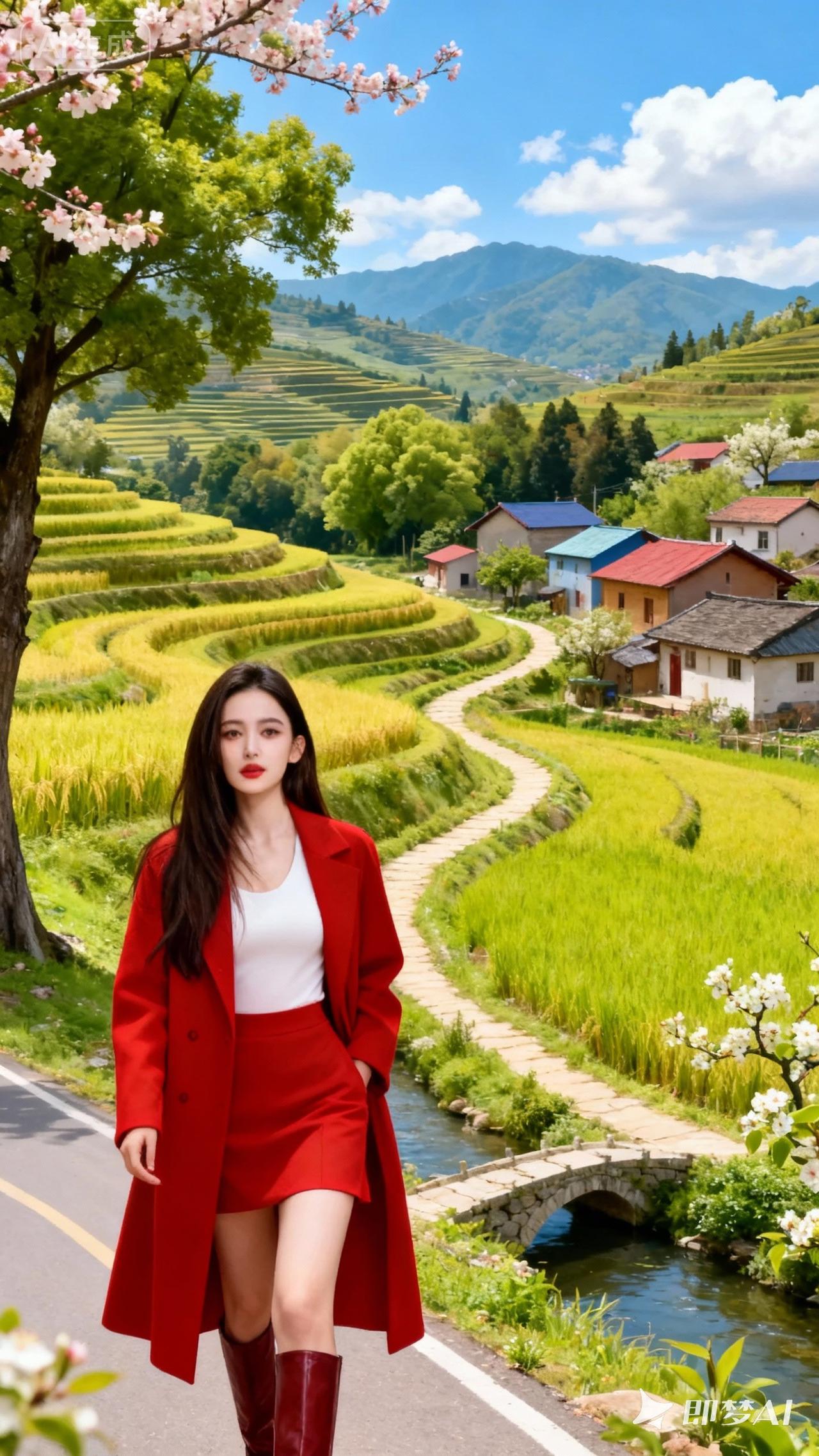 春日漫步在田野间,红裙飘逸,绿意盎然。