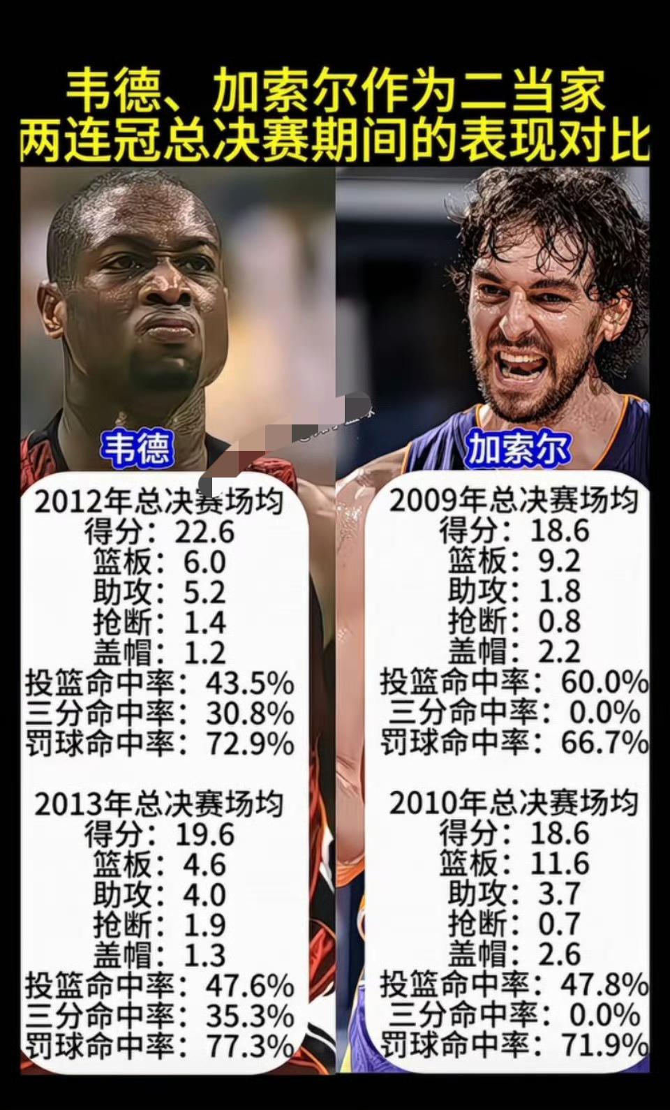 詹姆斯身边的韦德vs科比身边的加索尔,在两连冠时总决赛的表现对比!谁更强? 韦德(热火2012-2013两连冠期间) 2012年总决赛场均22.6分6.0篮板5.2助攻1.4抢断1.2盖帽,投篮命中率43.5%; 2013年总决赛场均19.6分4.6篮板4.0助攻1.9抢断1.3盖帽,投篮命中率47.6%。 保罗·加索尔(湖人2009-2010两连冠期间) 2009年总决赛场均18.6分9.2篮板1.8助攻0.8抢断2.2盖帽,投篮命中率60.0%; 2010年总决赛场均18.6分11.6篮板3.7助攻0.7抢断2.6盖帽,投篮命中率47.8%。