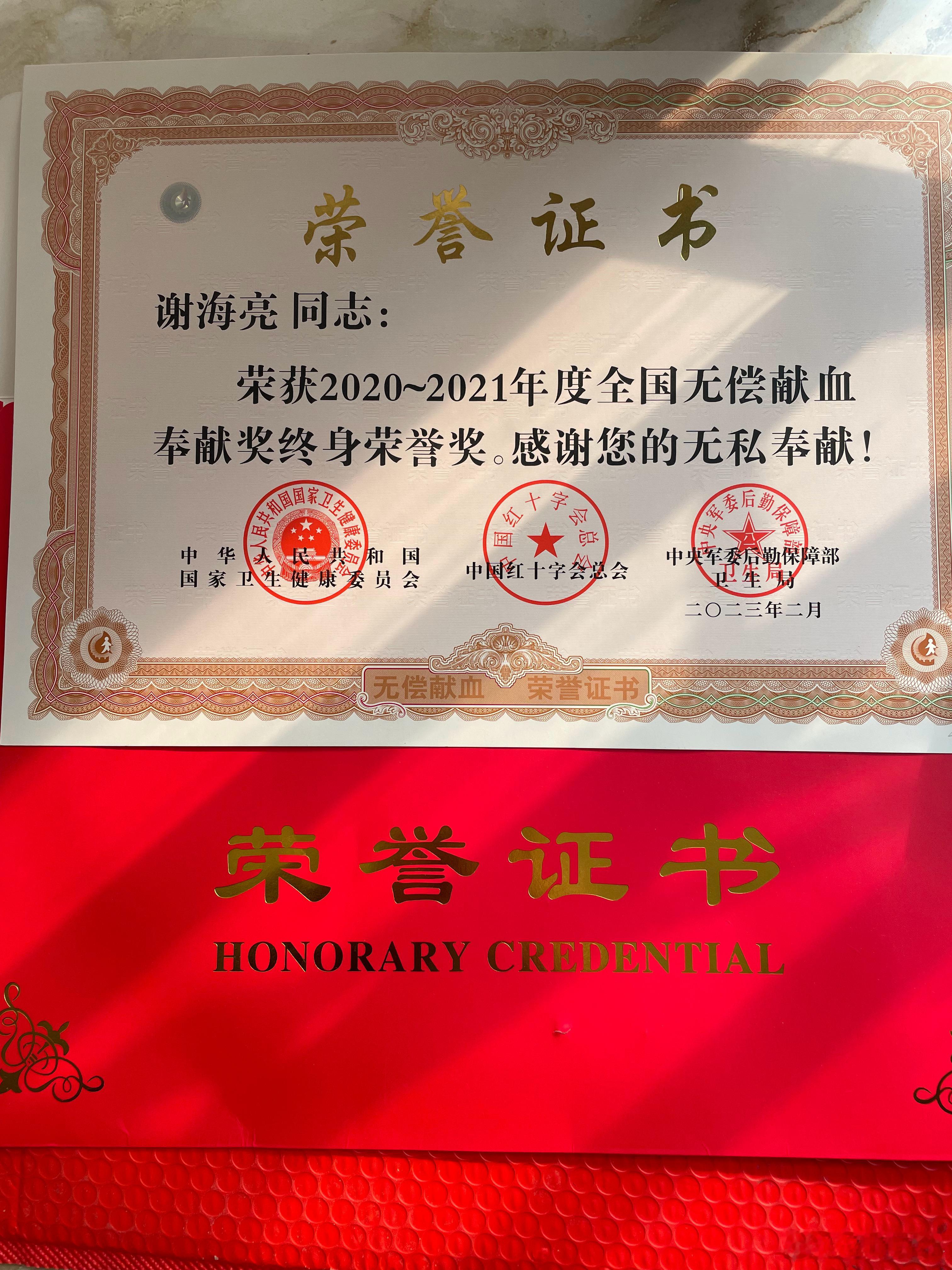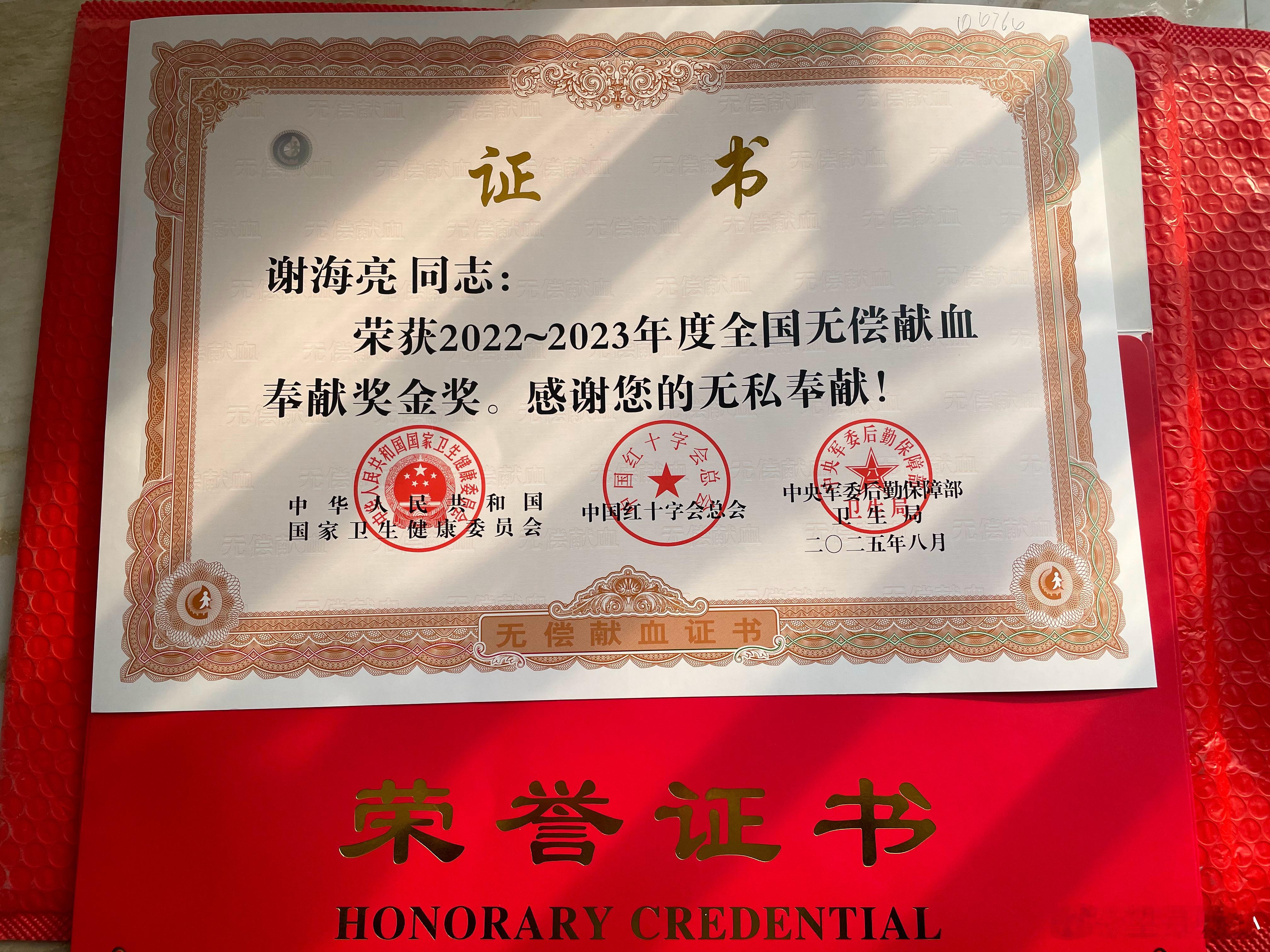 2022-23年度全国无偿献血奉献奖金奖发下来了山东还准备了礼品上一次终身荣誉奖啥也没有不过还是谢谢山东省血液中心,有心了