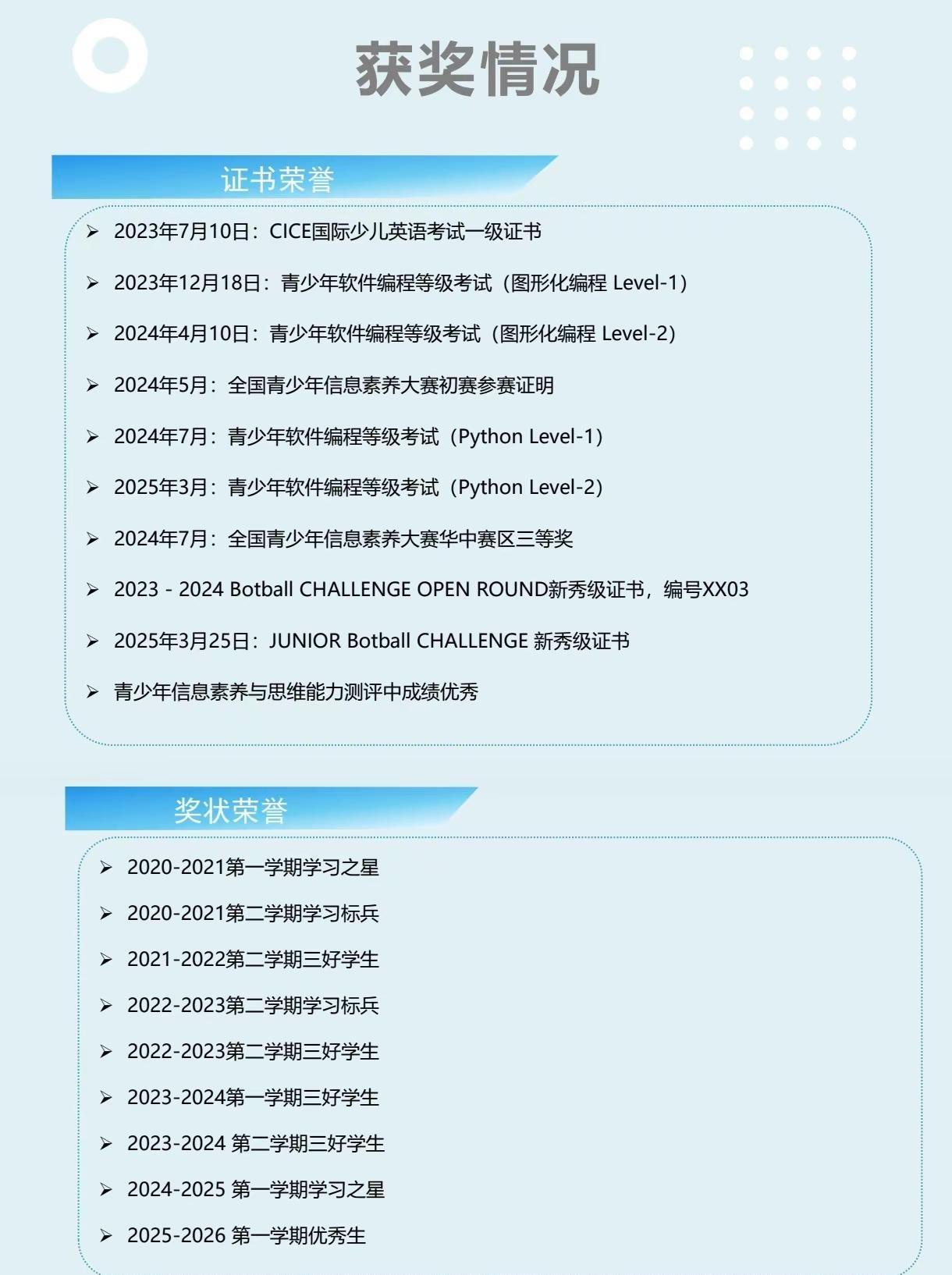 成功不是偶然的恩赐,而是干锤百炼后的绽放,荣誉不是辛运的眷顾,而是无悔付出的回响,6年了为了这份简历 !儿子的付出的点滴积累,如同电影胶卷的帧帧相接!!!努力就会有收获 希望可以为你小升初加分!
