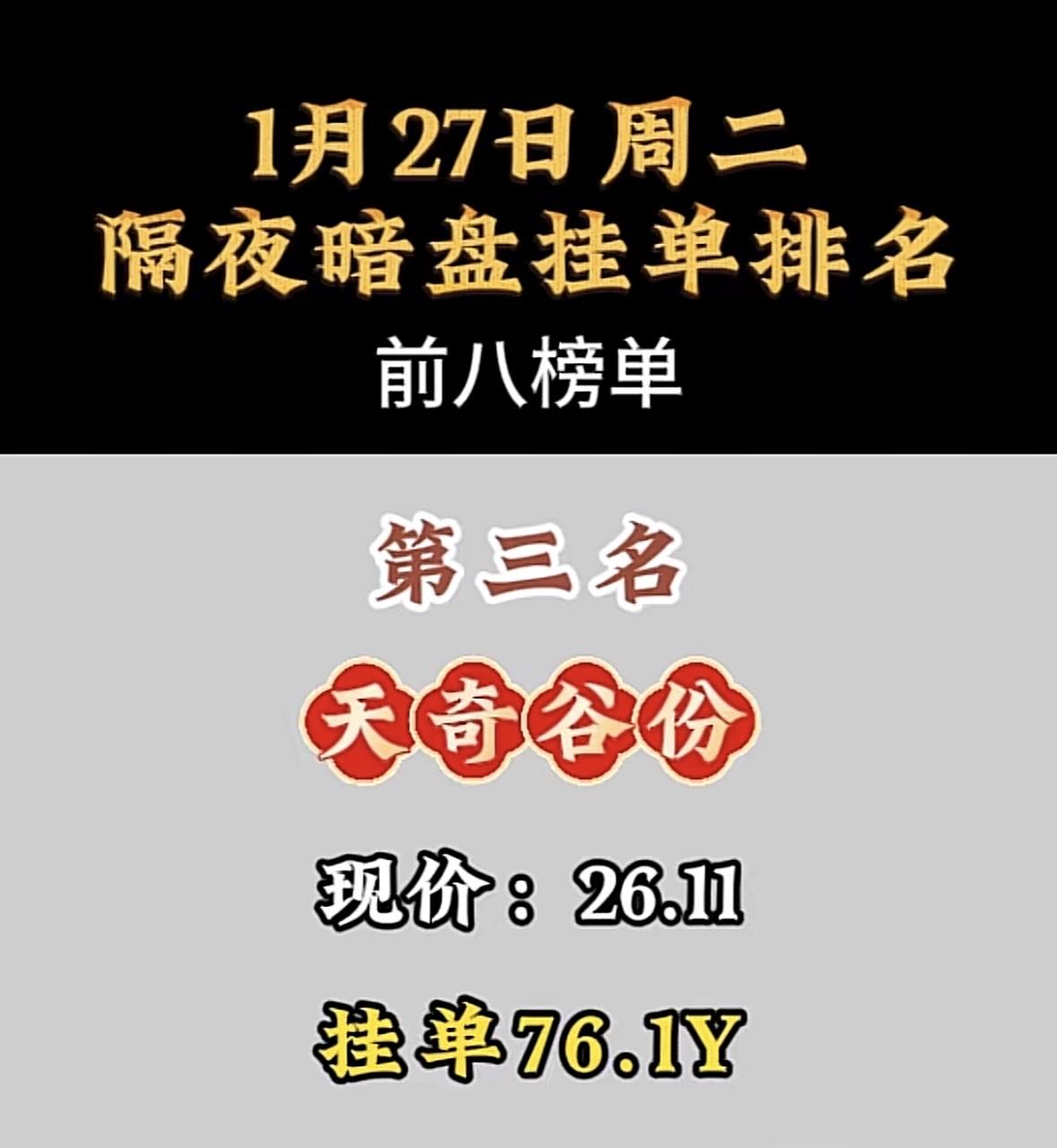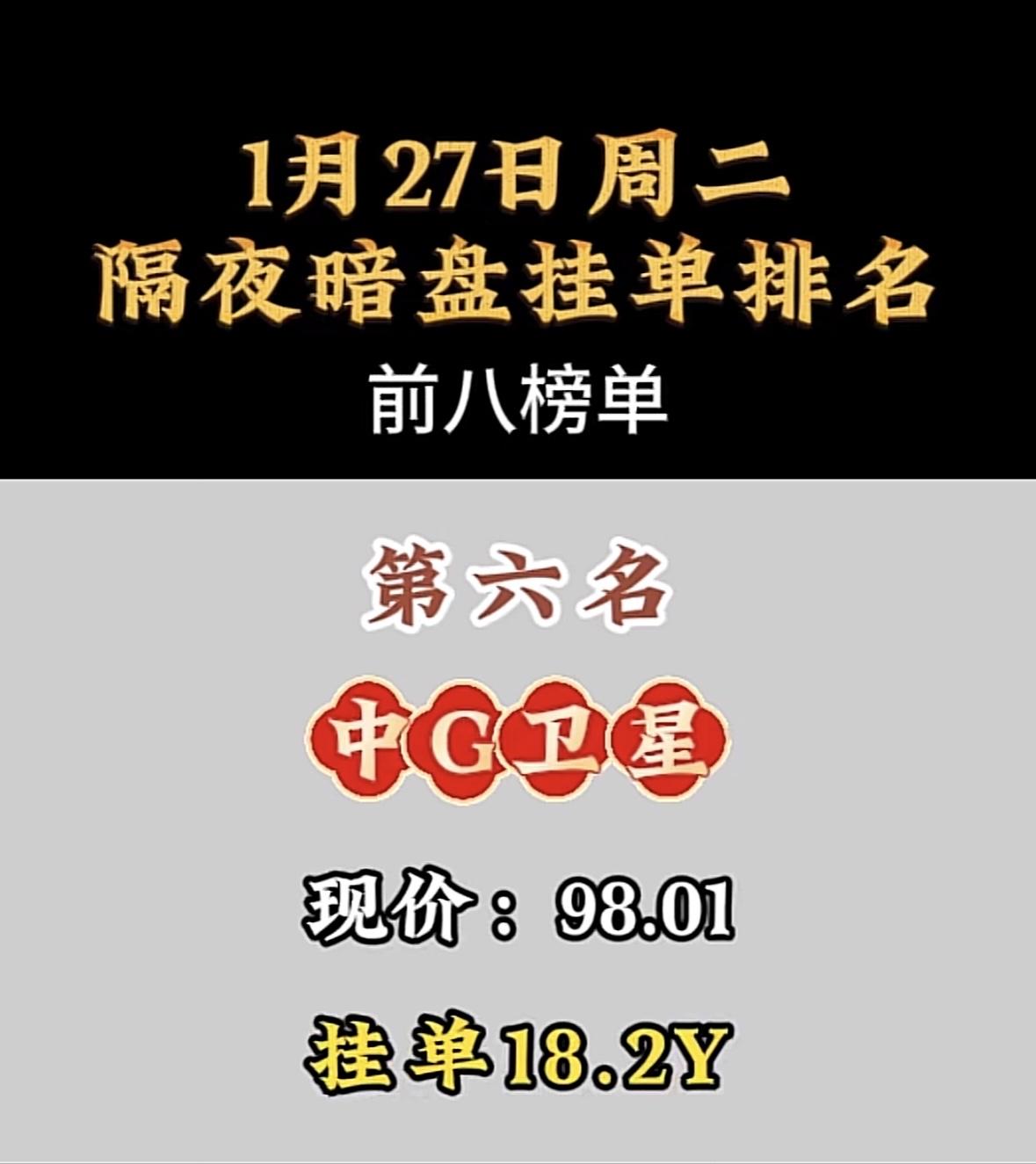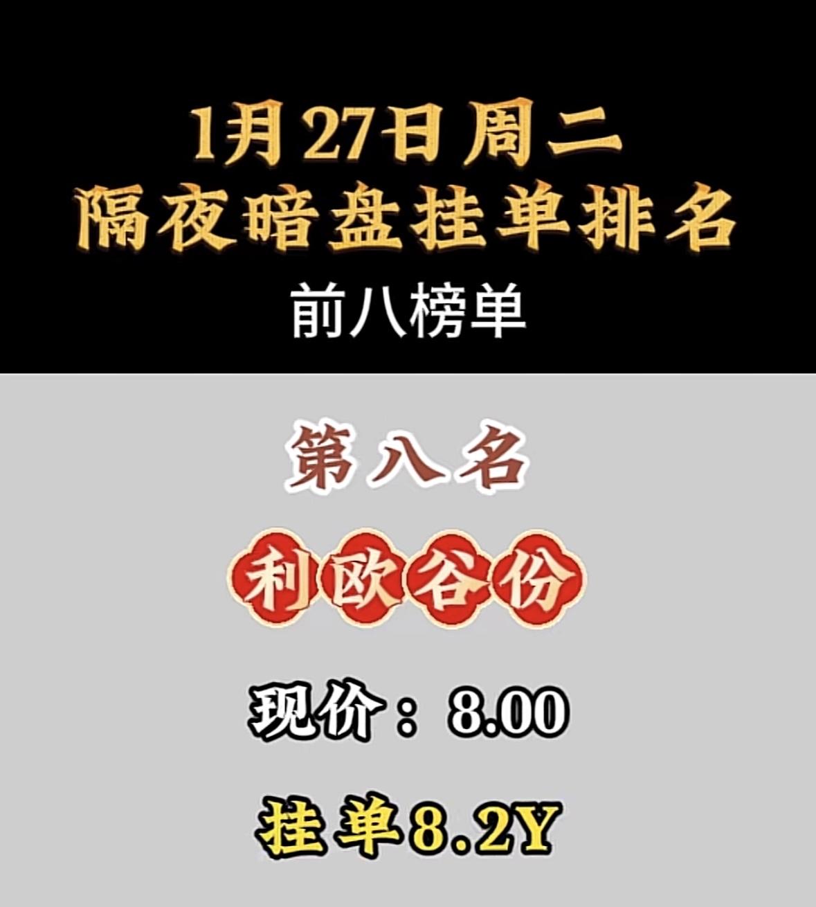 1月27日暗盘隔夜挂单前8名 利欧谷份:现价8.00,挂单8.2Y,隔夜暗盘排名第八! 航天电子领跑暗盘交易,挂单量遥遥领先,市场关注度飙升。 "航天电子登顶暗盘榜首,表现亮眼!"