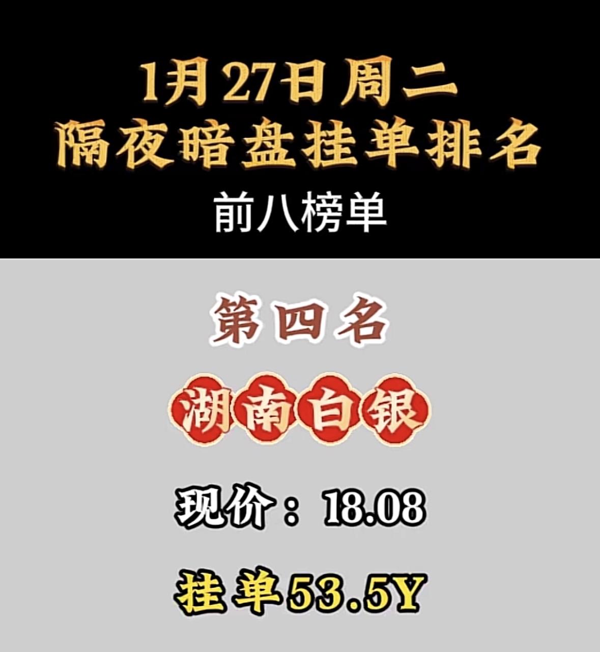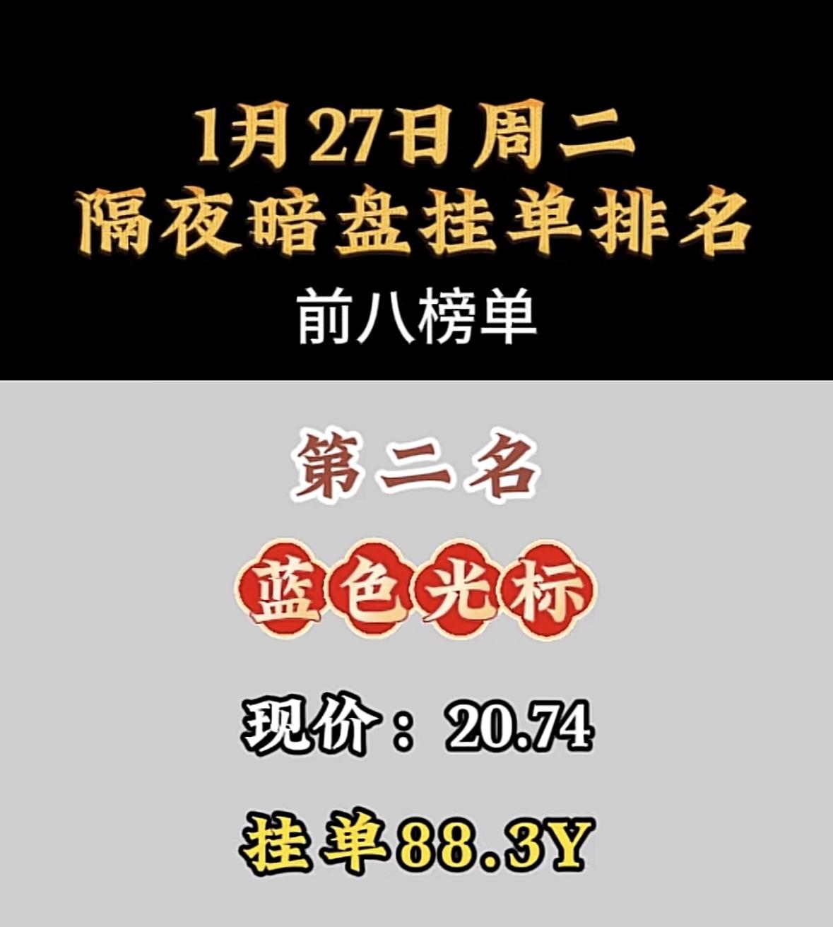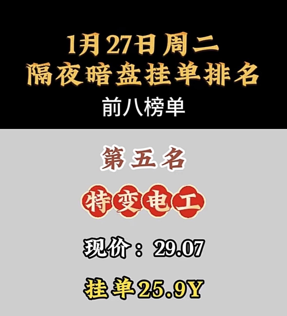 1月27日暗盘隔夜挂单前8名 利欧谷份:现价8.00,挂单8.2Y,隔夜暗盘排名第八! 航天电子领跑暗盘交易,挂单量遥遥领先,市场关注度飙升。 "航天电子登顶暗盘榜首,表现亮眼!"