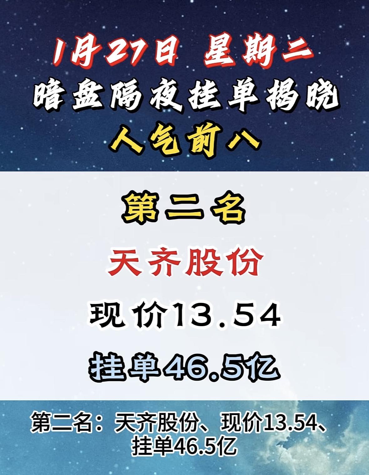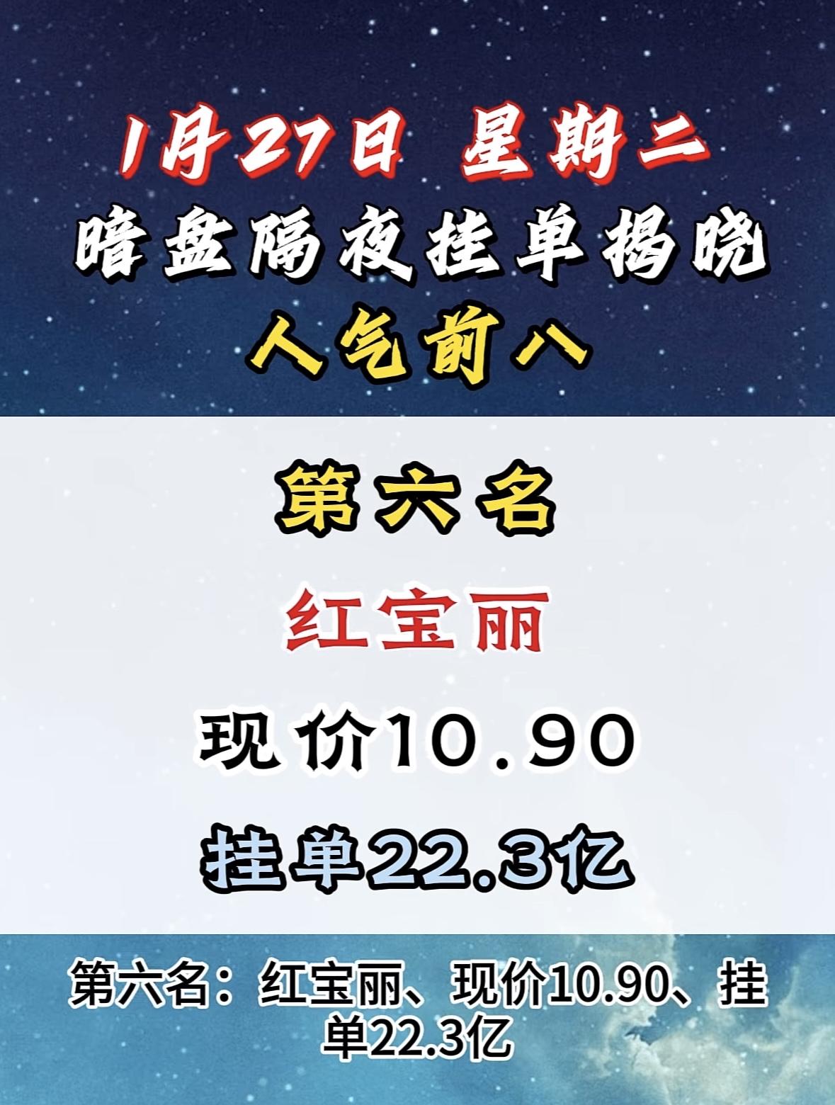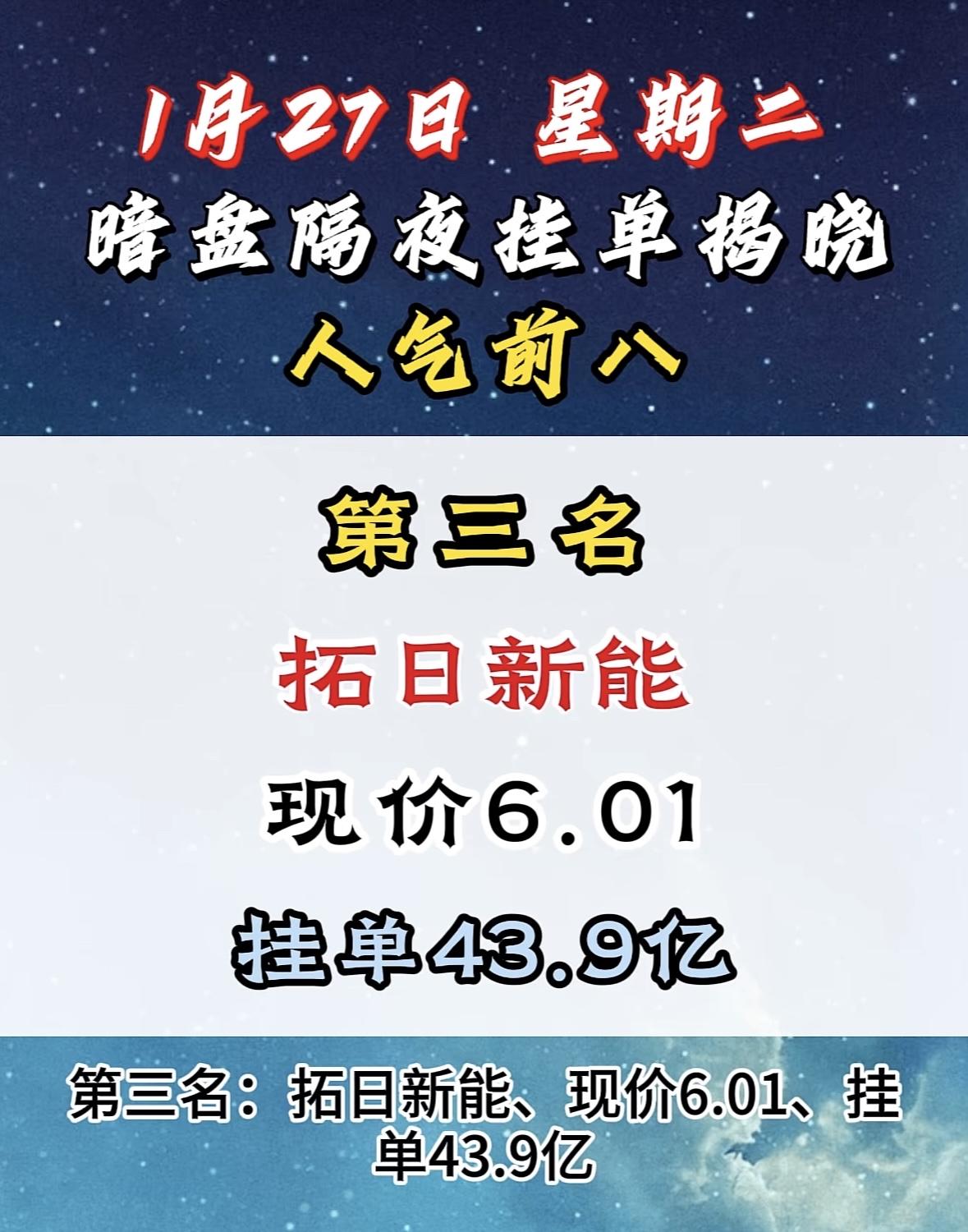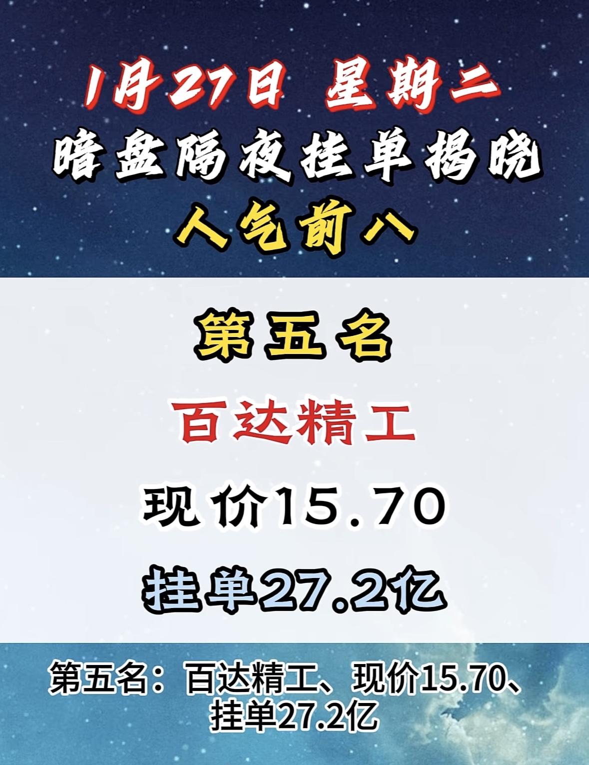 1月27日暗盘隔夜挂单前8名 大位科技今日揭晓,现价10.54,挂单14.7亿,人气前八! "明阳智能登顶人气榜首,暗盘挂单亮眼,市场热度飙升!"