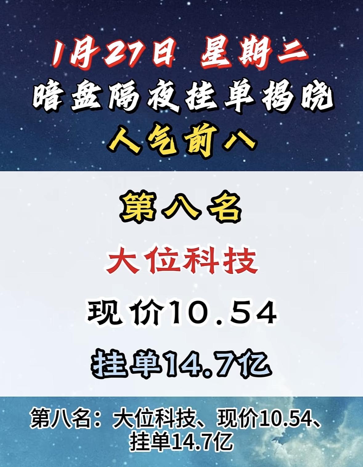 1月27日暗盘隔夜挂单前8名 大位科技今日揭晓,现价10.54,挂单14.7亿