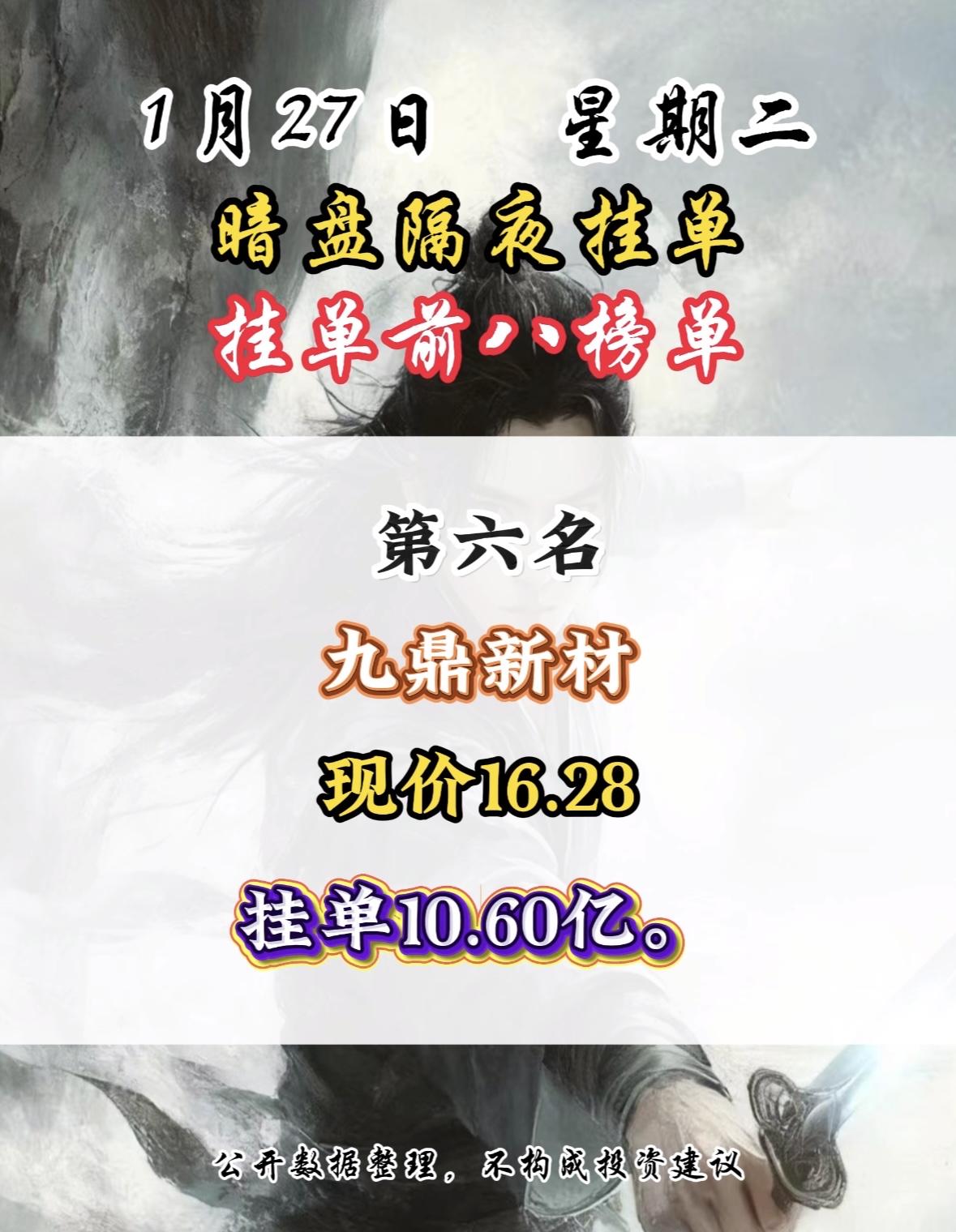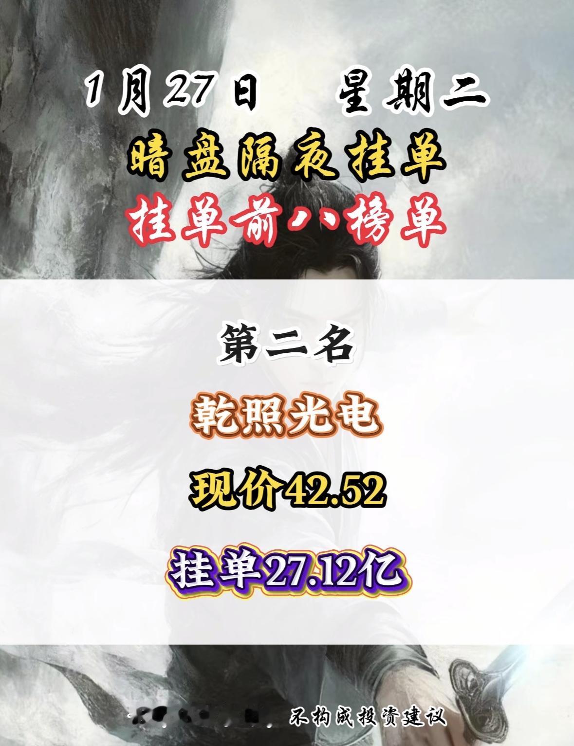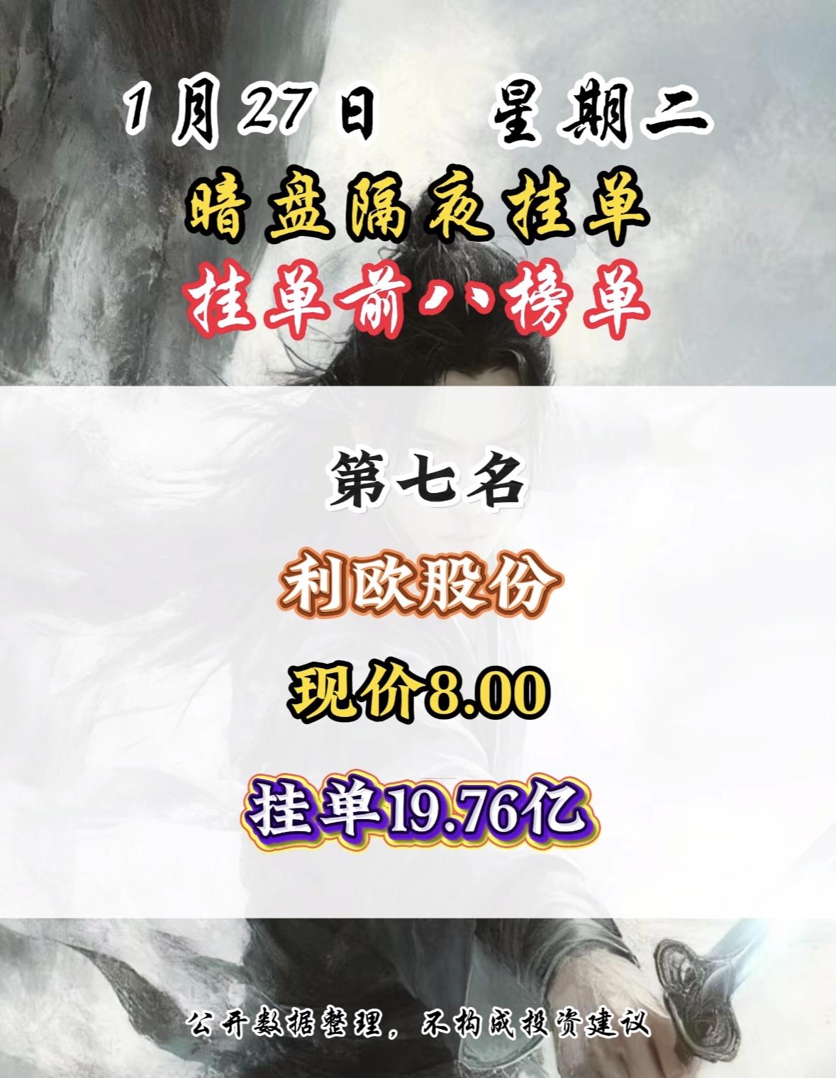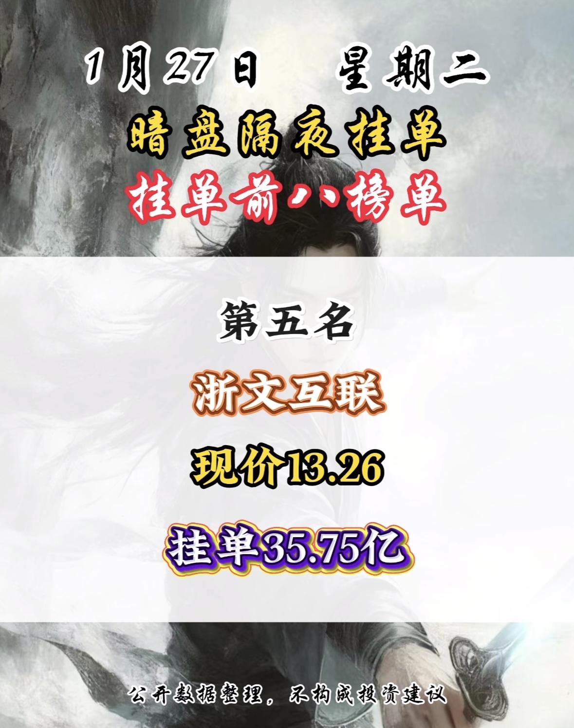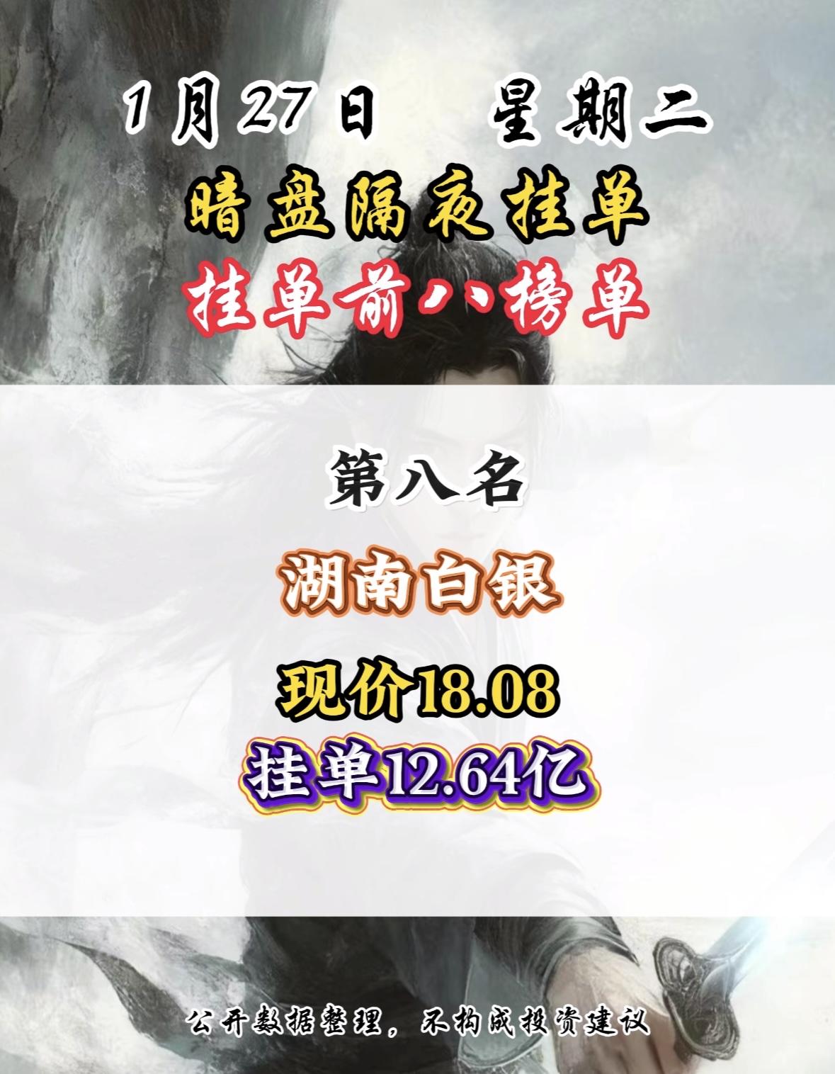 1月27日暗盘隔夜挂单前8名,湖南白银现价18.08,挂单12.64亿,第八名! 白银有色隔夜挂单量居首,市场关注度飙升,数据仅供参考。 白银有色现价11.41元,隔夜挂单39.64亿居首,公开数据仅供参考。