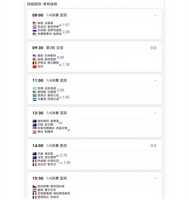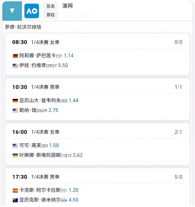 1月27日澳网赛程!! 四分之一决赛陆续开始!! 8:30:萨巴伦卡vs约维奇 9:30张帅/梅尔滕斯vs斯特恩斯组合 10:30兹维列夫vs勒纳.钱 16:00高芙vs斯维托丽娜 17:30阿尔卡拉斯vs德米纳尔 每一场都不可错过!!2026澳网 澳网名单 澳网赛事