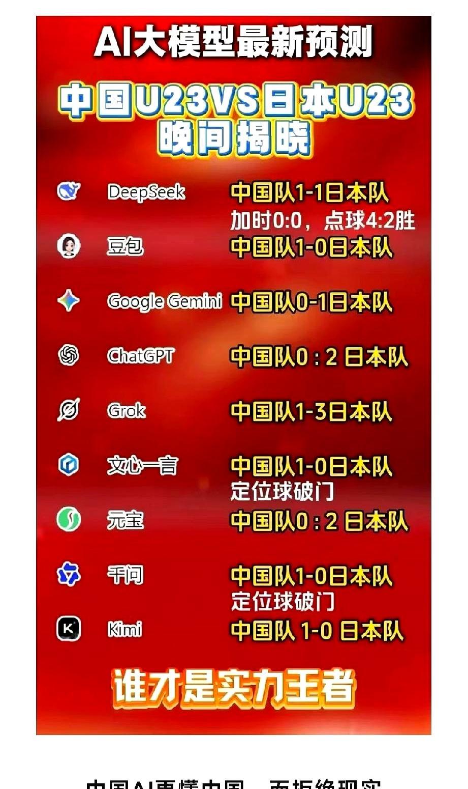 决赛哨响,0比 4,板子结结实实拍在脸上。 赛前国产 AI 清一色“五五开”“能爆冷”,国外模型直接写“输两球起步”。数据面前,嘴硬没用。 不是球员不想拼,是脚下差距明摆着:人家一脚出球像装导航,我们三脚还停到边线。 AI 再香也救不了基本功,输不可怕,可怕的是拿算法当遮羞布。 真想翻身,先别急着训模型,回去把停传带练顺,比啥预测都准。