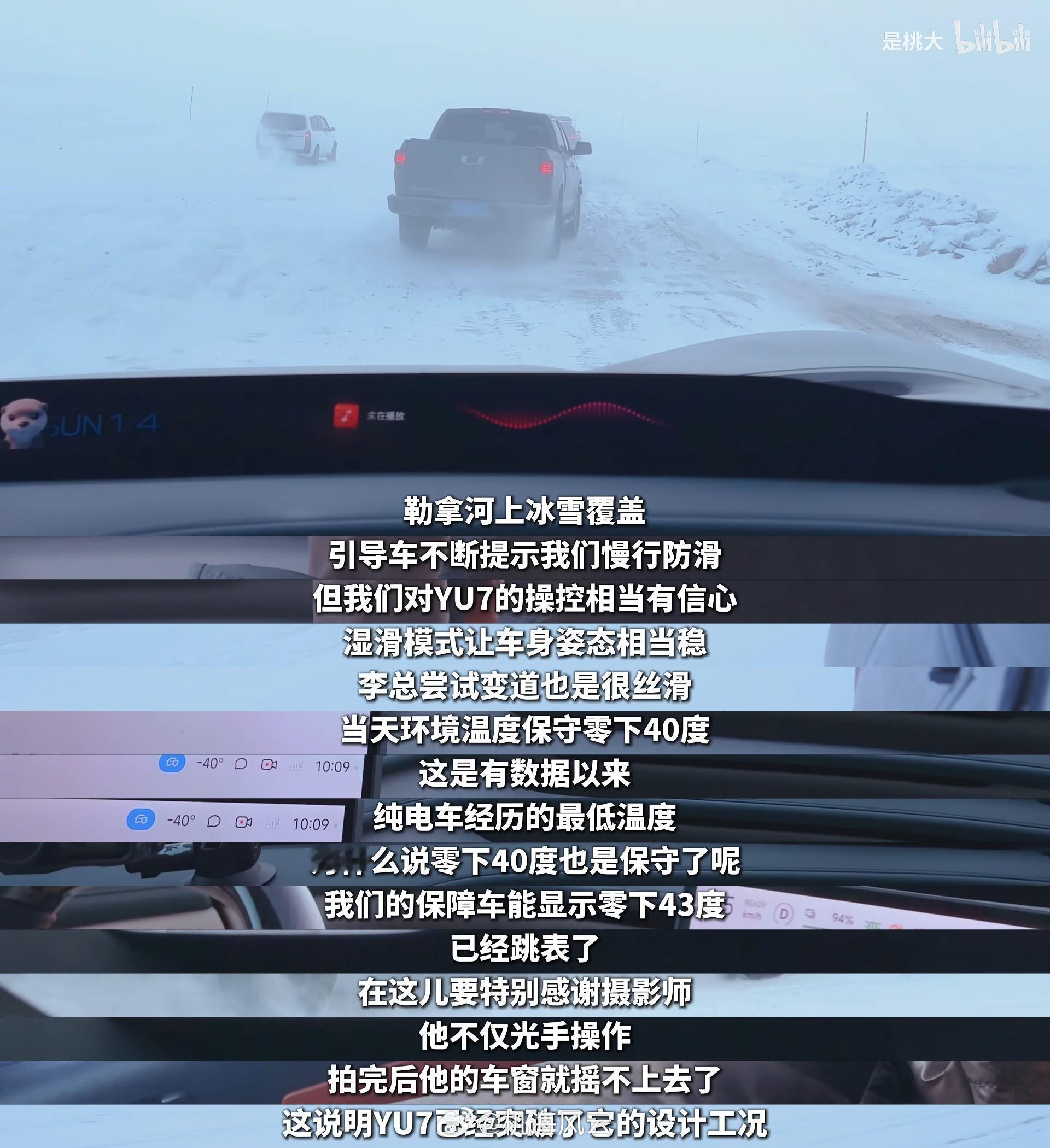 都说是骡子是马拉出来溜溜!万万没想到有UP直接拿它的小米YU7在零下40°开溜,生生创下了国产电车史无前例的第一次,谁说凡人创造不了历史?敢勇闯勒拿河,也妥妥是平凡中的不平凡,因为想模仿都得具备财力和胆气还有技艺……最关键的是车得争气!当保障车的仪表盘都冻到跳探戈,YU7却一往无前纵情驰骋,在零下40多度的极寒环境跑出了280公里续航成绩,用硬实力刷新国产纯电车的极限纪录,更重要的是,极限大考从来不是主要目的,试想,当零下40多度都畅行无阻时,北方冬季普遍的零下一二十度,驾驭起来还不妥妥降维打击——So Easy!本质上跟小米跑纽北、跑24小时拉力……都一样,当然,这或许是测试UP的极限,可能还不是YU7的极限,但是已经足够代表绝大多数人理解的极端工况天花板了,这大抵就是挑战的意义~