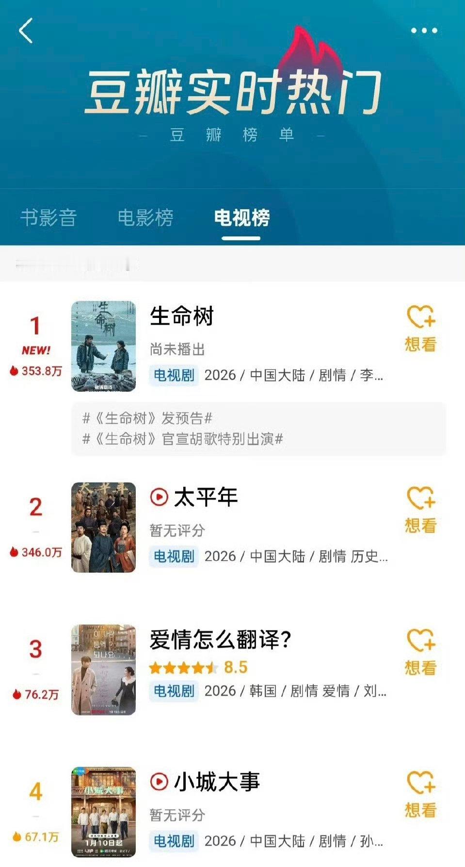 杨紫《生命树》预约破80w!豆瓣双榜登顶第一