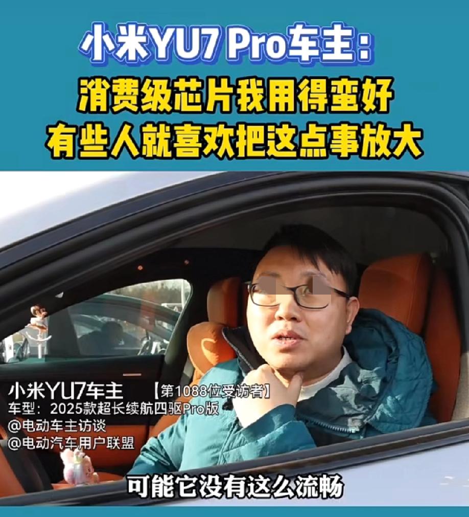 网友现场采访小米yu7pro车主,在谈到这款车用到的是消费级芯片的时候,这位车主表示:自己用的很流畅的,反而觉得如果用到的是车规级芯片,可能它还没有现在这么流畅呢…… 网友吐槽:这就是米粉所谓的自适应能力吧?即便他偶尔确实遇到卡顿或者死机,在不影响驾驶的情况之下,你觉得他会当着一个外人说出来吗?除非这个死机或者卡顿现象影响到了他的驾驶体验,他才有可能说出来。可能很多人还是会选择“打碎牙齿和血往肚里咽”而不说出来,人都要面子的吗,特别是他们这个群体,更要面子,更喜欢装杯! 评论区诸君,你们觉得呢?