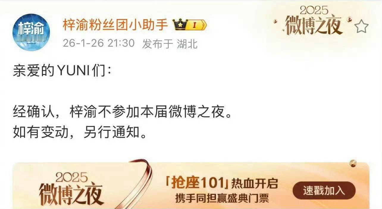 梓渝、田栩宁不出席微博之夜