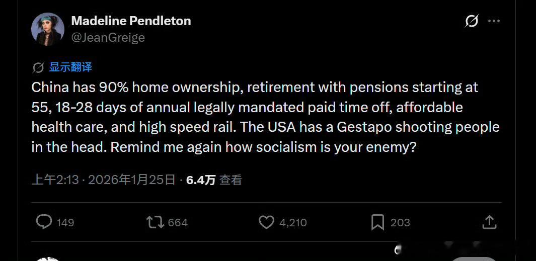 最近美国网友进步的很快呀,这姐们说:中国有90%的住房拥有率,55岁起享受养老金退休,18-28天的法定年假带薪休假,负担得起的医疗保健,还有高铁。而美国有盖世太保在枪杀人民。美国再次提醒我,为什么社会主义是你的敌人。