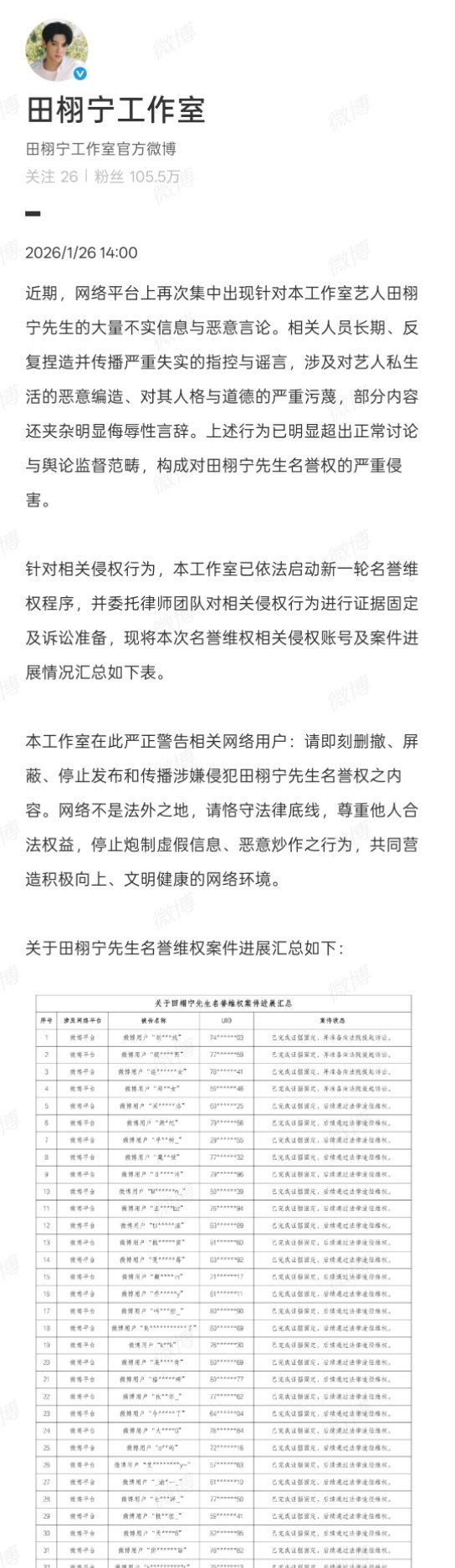 田栩宁把梓渝粉丝告了田栩宁工作室发了名誉维权案件进展,名单里好多梓渝粉丝……