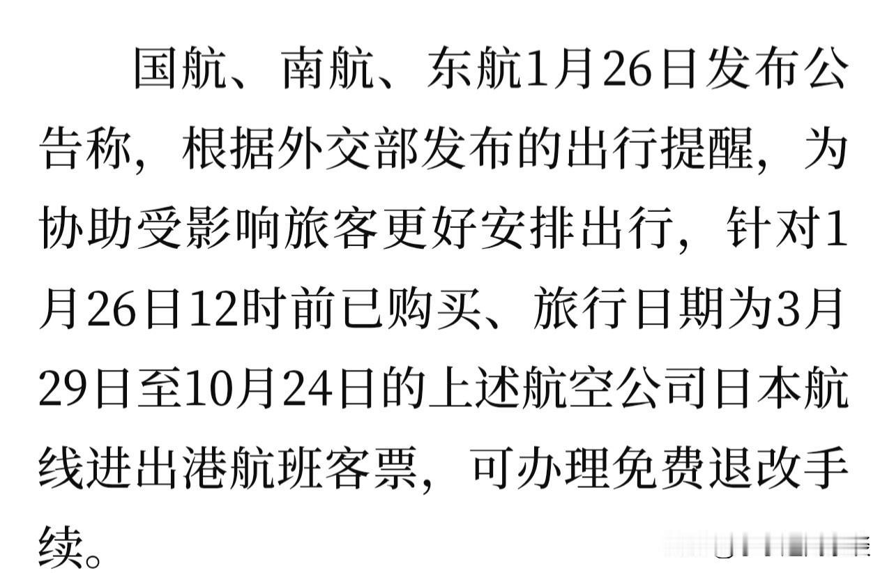 继续反制,中日49条航线全部取消,春节去日本的念头早点打消!!! 1月26日外交部一句“非必要别去日本”刚落,中国航空业立马跟上节奏,49条中日航线瞬间清零,不是减班,是整条线直接拔掉,各大航司陆续发布免退改通知,仿佛默契演练过,镜头切到东京,高市早苗还在镜头前咧嘴,下一秒机票价格飙成冲天炮,想去的人这才慌了,票在手,路却没了。 这不是简单的旅游提醒,这是国家把桌子掀了,把话挑明,日本近期对华敌意拉满,从政客嘴炮到民间挑衅,步步升级,我们若还揣着护照往那边送钱,就是亲手给对面递子弹,别拿“个人自由”当挡箭牌,自由不是真空,它长在国家的羽翼下,翅膀都淋雨了,你还非要往外飞,那叫自私,南航的免退改政策就是温柔一刀,国家把台阶铺到你脚边,再不下,可就真成台阶上的小丑了,有人说,我就想去,花自己的钱碍谁了,来,算笔账,你砸在日本的每一万日元,最终变成消费税,变成防卫费,变成对准我们的导弹零件。春节是什么,是祖先隔着千年喊我们回家,是血脉叫我们团圆,你偏要飞到潜在敌国的街头去给人点头哈腰,脊梁骨不会痛吗,更现实的是,当地右翼早把“中国游客”当移动钱包加出气筒,言语推搡都算轻,万一真爆发冲突,领事保护再快也得飞几个小时,你受的委屈只能自己咽,别幻想“我又没惹事”,在群体情绪面前,个体的无辜就像纸片,一戳就破。 再看日本经济,全靠旅游吊着一口气,我们这边只要集体转身,它的百货、酒店、药妆店、机场免税店,立刻断氧,高市早苗之所以敢嚣张,就是赌我们心软,赌我们好了伤疤忘了疼,只要春节数据一跌,她背后的金主就会先跳脚,首相位子自然晃成秋千,所以,取消航班不是麻烦,是战略,是民间版制裁,是让你我坐在家里就能打出去的拳头,别小看这张机票,它此刻就是选票,选的是尊严还是卑微,是团结还是散沙,历史无数次证明,群众转身,山河变色,1982加拿大一次游客锐减,就逼得地方政府低头道歉,今天我们十四亿人一起转身,效果堪比航母掉头。 有人担心退票麻烦,南航已经示范,免手续费全额退,你点一下手机就能回家吃团圆饭,成本为零,收益却是给国家递上一张王牌,还犹豫什么,有人说日韩一起骂,为何只盯日本,因为日本政客跳得最高,伤害最深,先摁住最跳的,才有震慑,这叫精准反制,也叫杀鸡儆猴,节奏感要踩准,拳头要打到肉,才能少流真正的血,此刻我们不去,就是最好的去,让东京街头空空荡荡,让他们的GDP报表出现黑洞,让高市早苗在深夜数着掉发的数字,这才是平民能干的战争,不见血,却分胜负,别等真正开火才想起自己该做什么,现在就能把火星掐灭,只要你动动手指,把机票退掉,把酒店取消,把购物清单扔进垃圾桶,对面就少一颗子弹,我们就多一分安全。 春节本该红红火火,别让日本的冷脸给自己添堵,祖国大好河山从三亚到哈尔滨,从喀什到厦门,哪里的烟花不够你看,哪里的饺子不够你吃,非要跑到别人的屋檐下受白眼,脑子进水才这么虐自己,记住,护照的硬度,由祖国的态度决定,祖国已经发声,你我只需跟上,这一步,比任何口号都响亮。 航线断了,台阶也铺好了,退还是飞,全在你一念之间,这个春节,你会让钱包说话,还是让脊梁挺起?如果机票免费退,你改不改目的地?