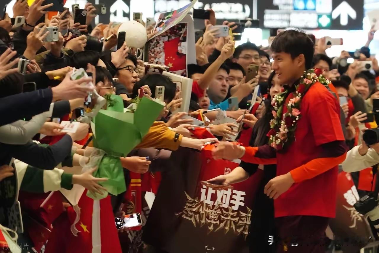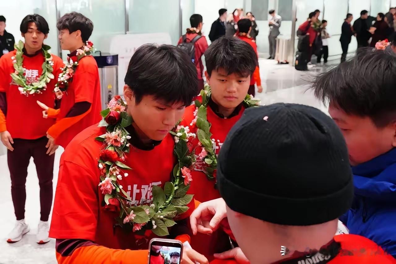 U23国足的小伙子们回来了,球迷热情接机,唯独缺了他们! 下午三点半的大兴机场,U23国足部分球员回国,早就被热情的球迷围得满满当当。有人两点不到就守在出口,举着横幅,攥着签名笔,眼睛直勾勾盯着通道口,生怕错过一个身影。 李昊、吾米提江、拜合拉木、向余望、彭啸、胡荷韬、李镇全……一个个熟悉的面孔从里面走出来,脸上还带着旅途的疲惫,却被现场的热情感动得直笑。 签名、合影、接受采访,每个人都耐心配合,手忙脚乱却透着真诚。于大宝也在其中,作为助理教练,他比球员们多了份沉稳,笑着跟球迷握手,偶尔还跟旁边的小伙子打趣两句,场面热闹得像过年。 谁都知道,这次他们没拿到冠军,可创造的历史分量不轻。赛场上那股子拼劲,早就让球迷把输赢看淡了。能在这么关键的比赛里踢出精气神,比奖杯更让人记挂。 可人群里也藏着点小遗憾,主教练安东尼奥直接回了西班牙,王玉栋、刘浩帆、张暧辉这些球迷念叨着的名字,也直接去了俱乐部,没跟着大部队回来。 有人举着写着他们名字的牌子,等了半天没见着人,悄悄把牌子收了起来,脸上的失落藏不住。“没见到王玉栋有点可惜,他那脚射门太帅了!” 一个穿红球衣的小伙子跟同伴念叨,语气里满是遗憾。旁边的大叔拍了拍他的肩膀:“没事,他们回俱乐部好好练,下次比赛再看他们进球!” 话是这么说,可这份期待里的小缺口,还是得靠时间来补。球迷的爱就是这样,既盼着球员们好好休息,又想多看他们一眼,哪怕只是远远挥个手。 现场的媒体也没闲着,摄像机镜头追着球员们转,话筒递到嘴边,问题一个接一个。“接下来有什么计划?”“对下一场比赛有信心吗?” 小伙子们虽然腼腆,回答却透着坚定:“好好练,争取下次更好!”这话听着简单,却比什么豪言壮语都实在。足球这东西,拼的就是日复一日的积累。这次回来的每一步,都是为了下次走得更稳。 其实球迷要的不多,赢了一起狂,输了一起扛,能看到球员们把赛场当战场,把球衣穿得有尊严,就够了。大兴机场这一幕幕,不过是这份心意的缩影——你为赛场拼搏,我为你守候归途。 没见到的那些球员,心里大概也清楚球迷的期待。直接回俱乐部,是不想耽误训练,这份职业态度,其实也是另一种回报。就像耕种的农夫,刚从一场重要的收获里回来,来不及歇脚就钻进田里,为下一季做准备。 夕阳透过机场的玻璃窗照进来,把每个人的影子拉得很长。签名签得手酸的球员,嗓子喊哑的球迷,扛着摄像机的记者,慢慢散去,心里却都揣着点热乎乎的东西。 这大概就是足球的魔力,它能把素不相识的人聚到一起,为同一个名字欢呼,为同一场比赛揪心。U23国足这次回来,带回来的不只是成绩,更是一份重新燃起的期待。 通道口的人渐渐少了,横幅被小心翼翼地叠起来,签名笔收进包里。有人回头望了望出口,像是还在等什么。其实大家都知道,等待不是结束,是新的开始。 中国队加油!这四个字,今天在机场被喊了无数遍,以后还会被喊无数遍。就像种子落在土里,只要有人浇水施肥,总有破土而出的一天。 大兴机场的喧嚣慢慢平息,可那份热情早顺着球员们的脚步,传到了训练场,传到了每一个期待的心里。下一次再见,想必又是另一番热闹景象。 U23国足抵京 多位七旬球迷接机